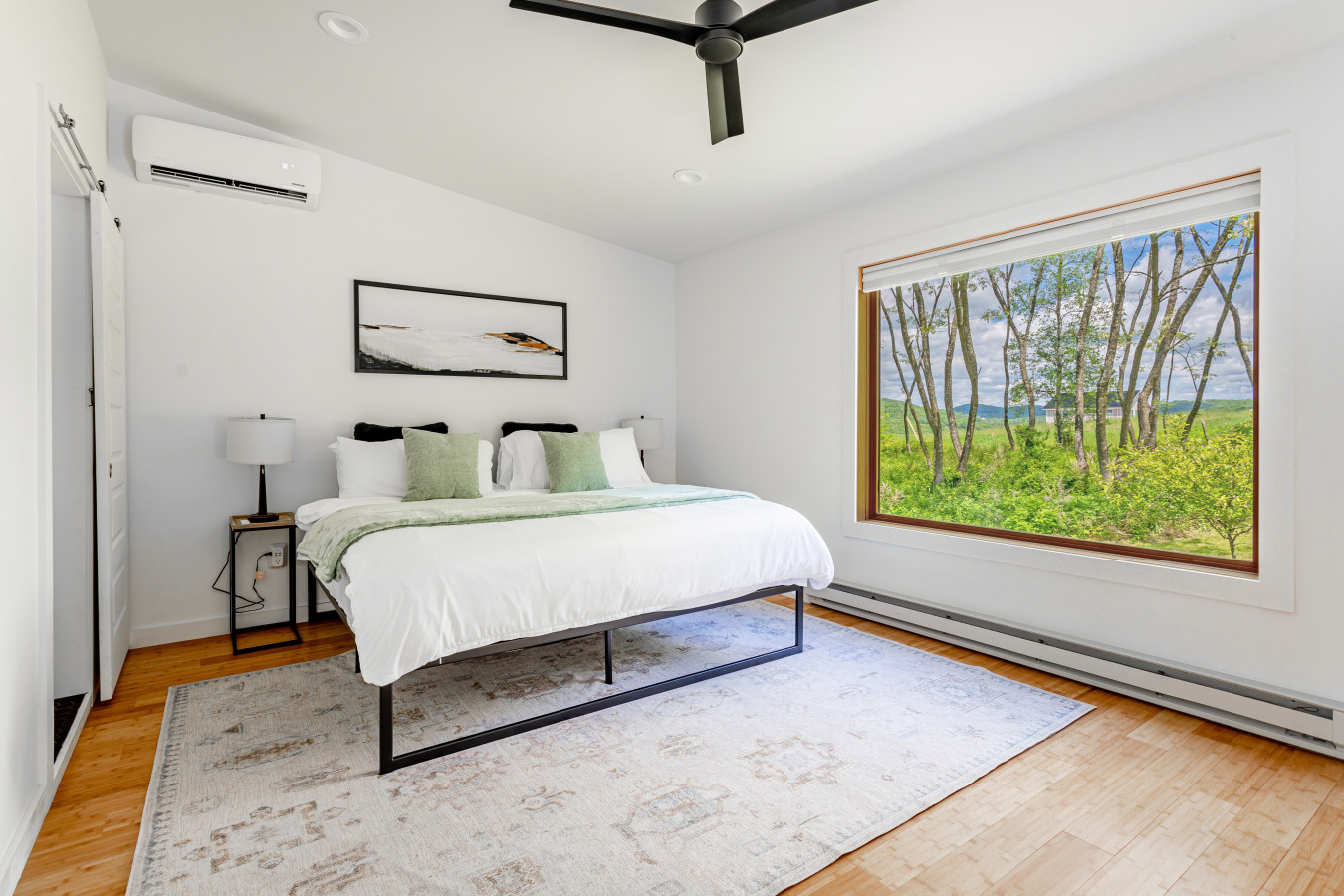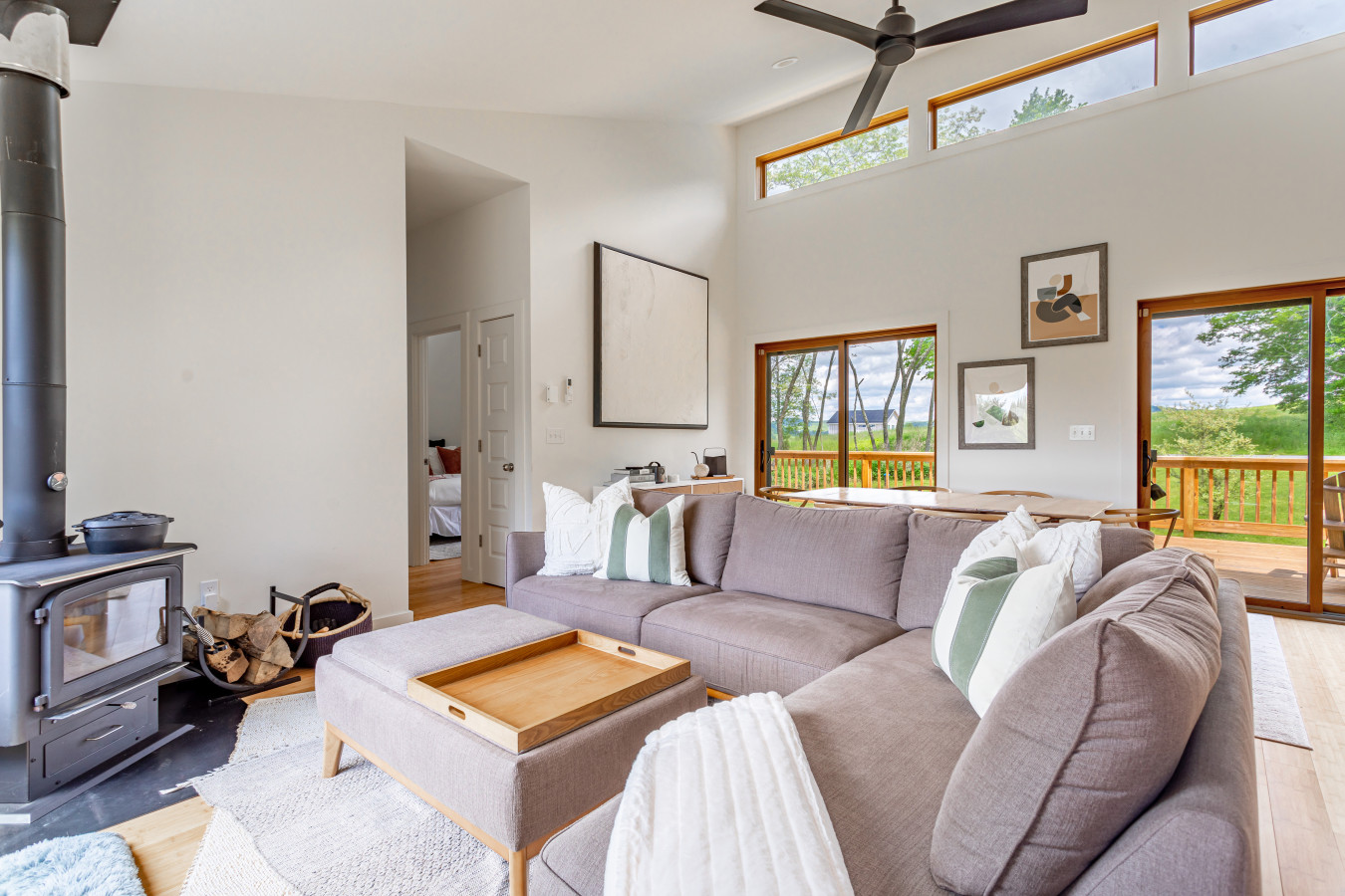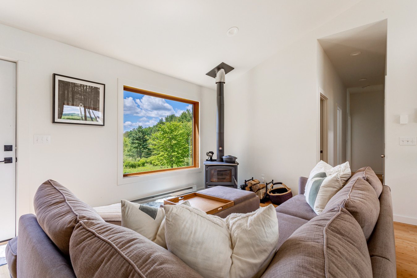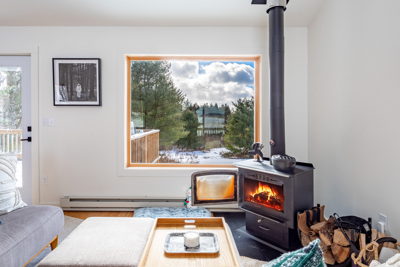 The main living area offers a fabulous integrated space for gathering; the kitchen, dining, and living areas are all separate but within easy chatting distance of each other. The kitchen offers a full suite of appliances that will rise to the occasion for any meal. The living area is gathered around an easy to use wood-stove and has a projector tv for cozy movie watching. With large windows to the front and back of the house, the beautiful woods and fields outside add a beautiful note to the ambience of the house.
