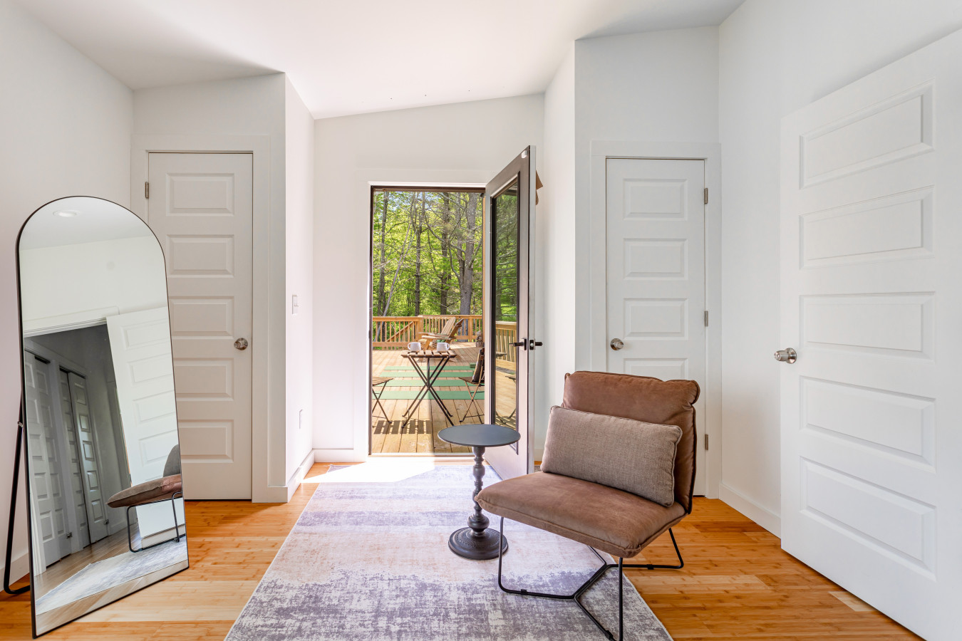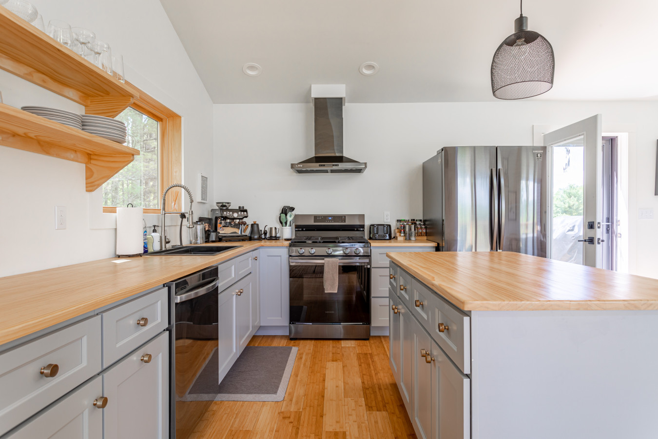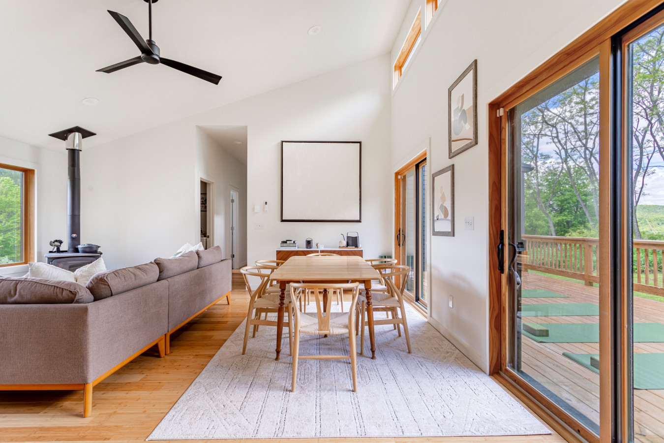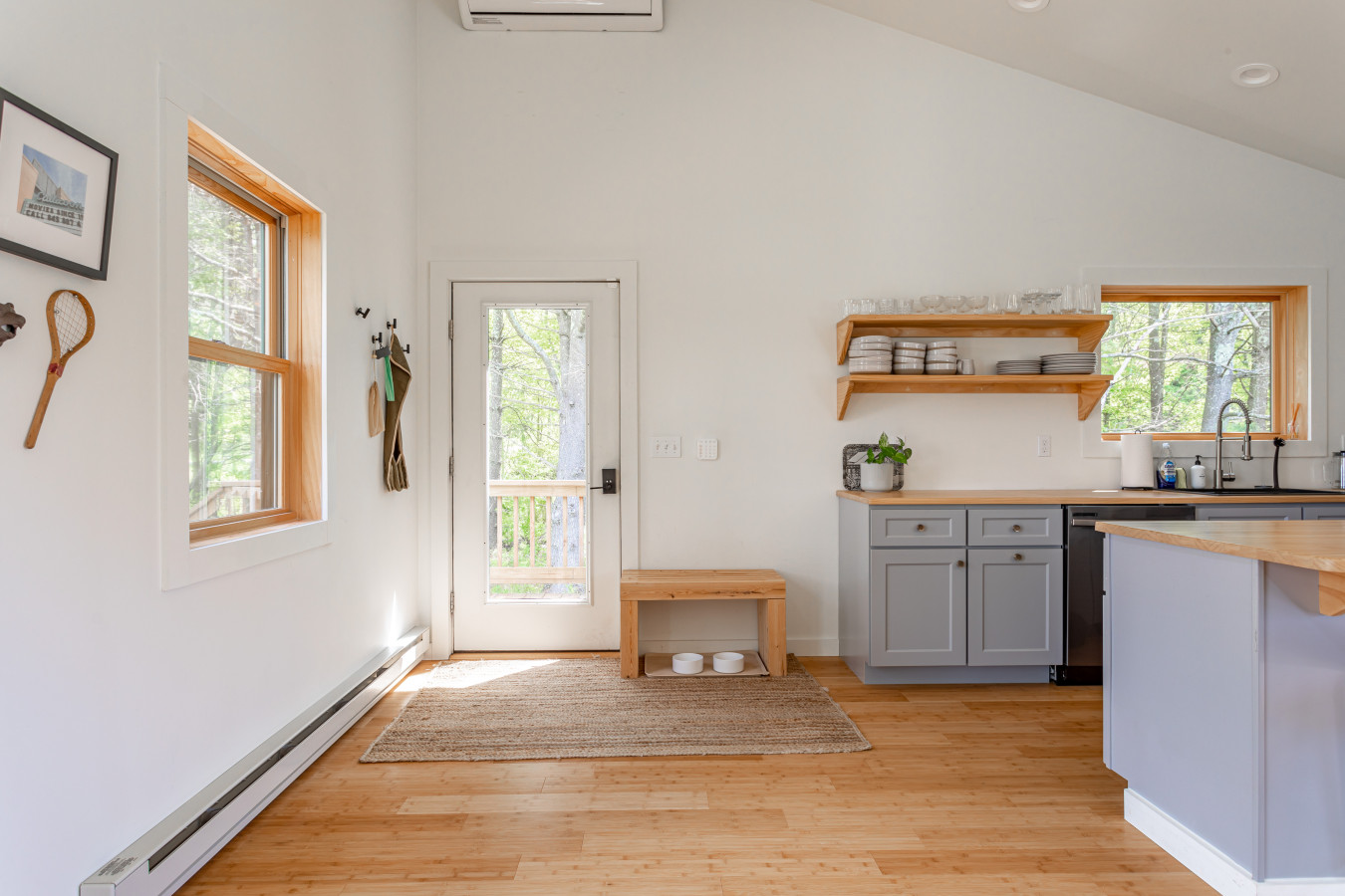 The main living area offers a fabulous integrated space for gathering; the kitchen, dining, and living areas are all separate but within easy chatting distance of each other. The kitchen offers a full suite of appliances that will rise to the occasion for any meal. The living area is gathered around an easy to use wood-stove and has a projector tv for cozy movie watching. With large windows to the front and back of the house, the beautiful woods and fields outside add a beautiful note to the ambience of the house.
