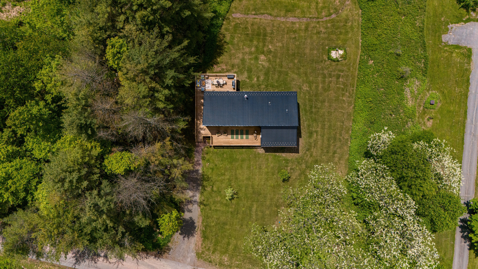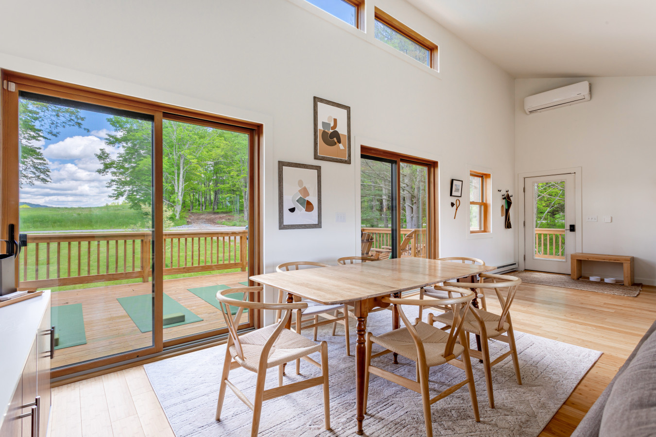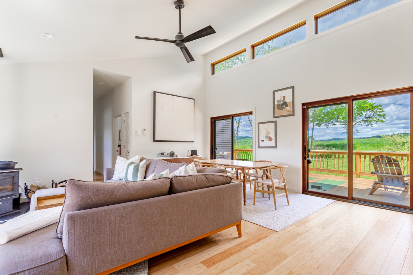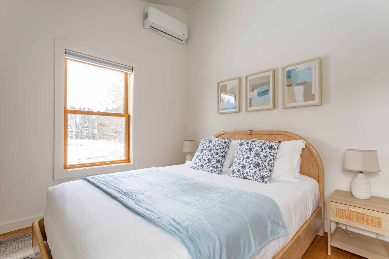 The main living area offers a fabulous integrated space for gathering; the kitchen, dining, and living areas are all separate but within easy chatting distance of each other. The kitchen offers a full suite of appliances that will rise to the occasion for any meal. The living area is gathered around an easy to use wood-stove and has a projector tv for cozy movie watching. With large windows to the front and back of the house, the beautiful woods and fields outside add a beautiful note to the ambience of the house.