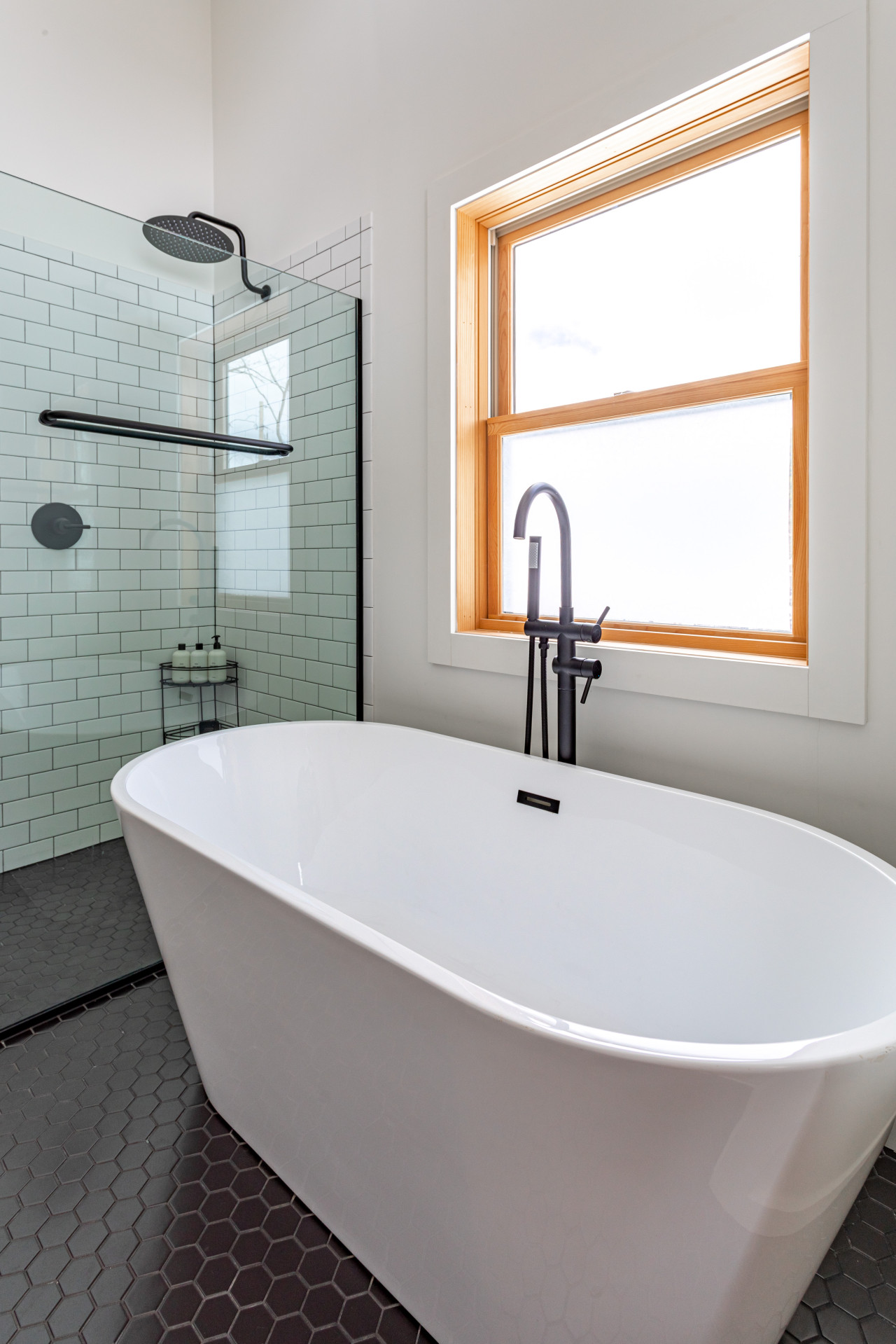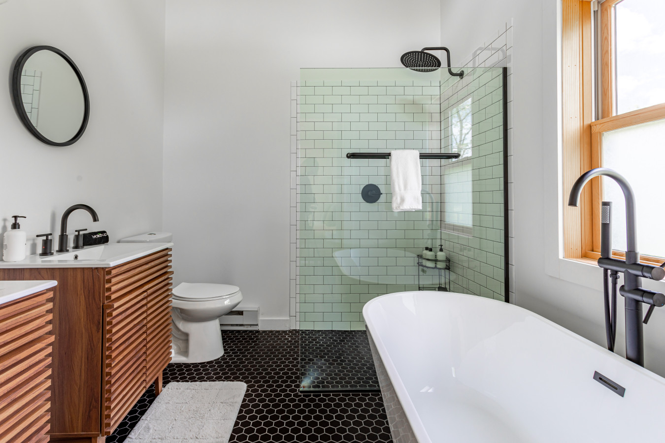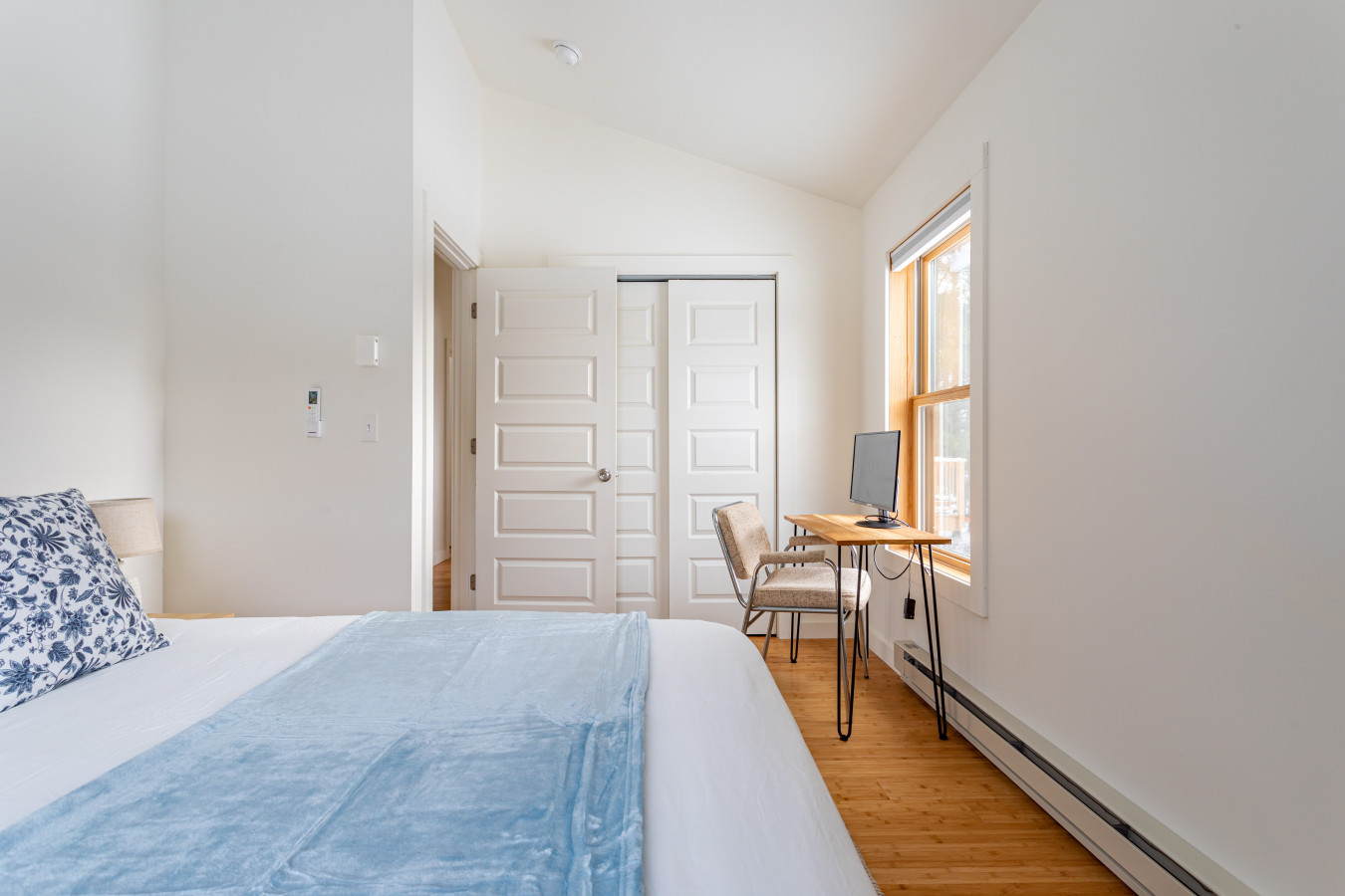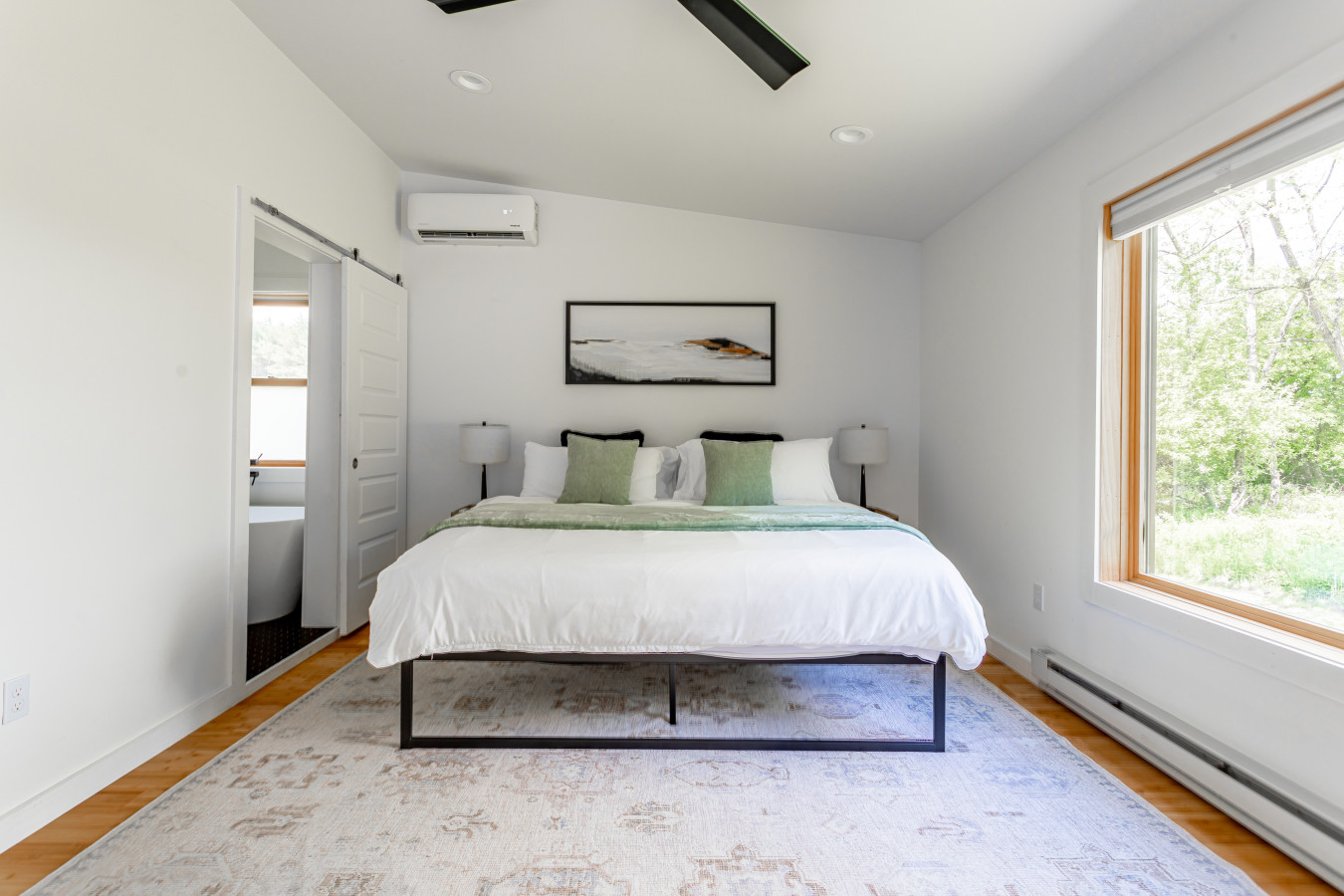 Bedrooms take up the other end of the home, with the principal towards the front and the two secondary facing the rear, both with a southern exposure. The main bedroom has a king bed, a lovely en-suite bathroom with high ceilings, a separate soaking tub and shower, as well as its own private access to the large front deck. There is a second hallway bathroom serving the other bedrooms.