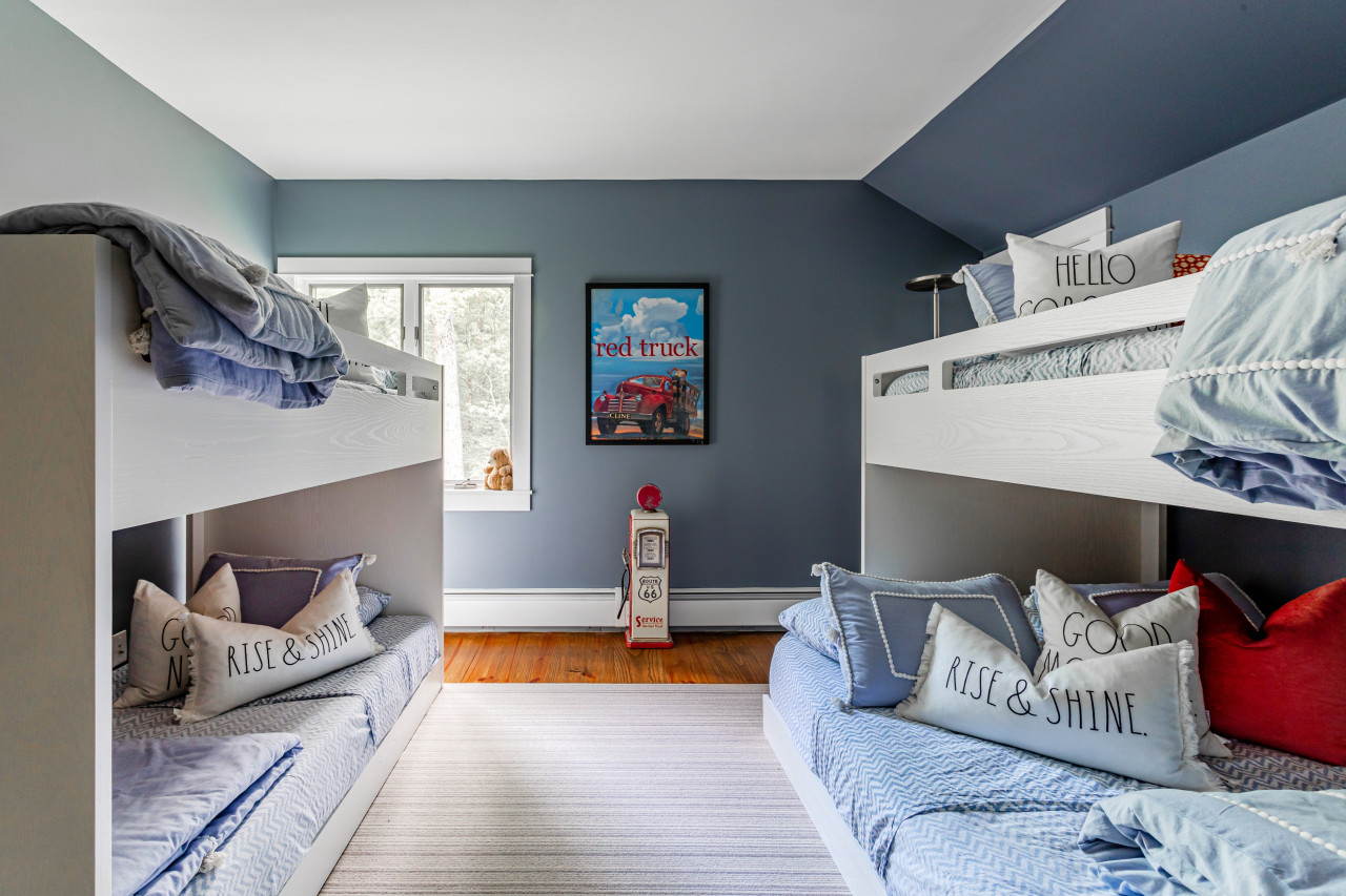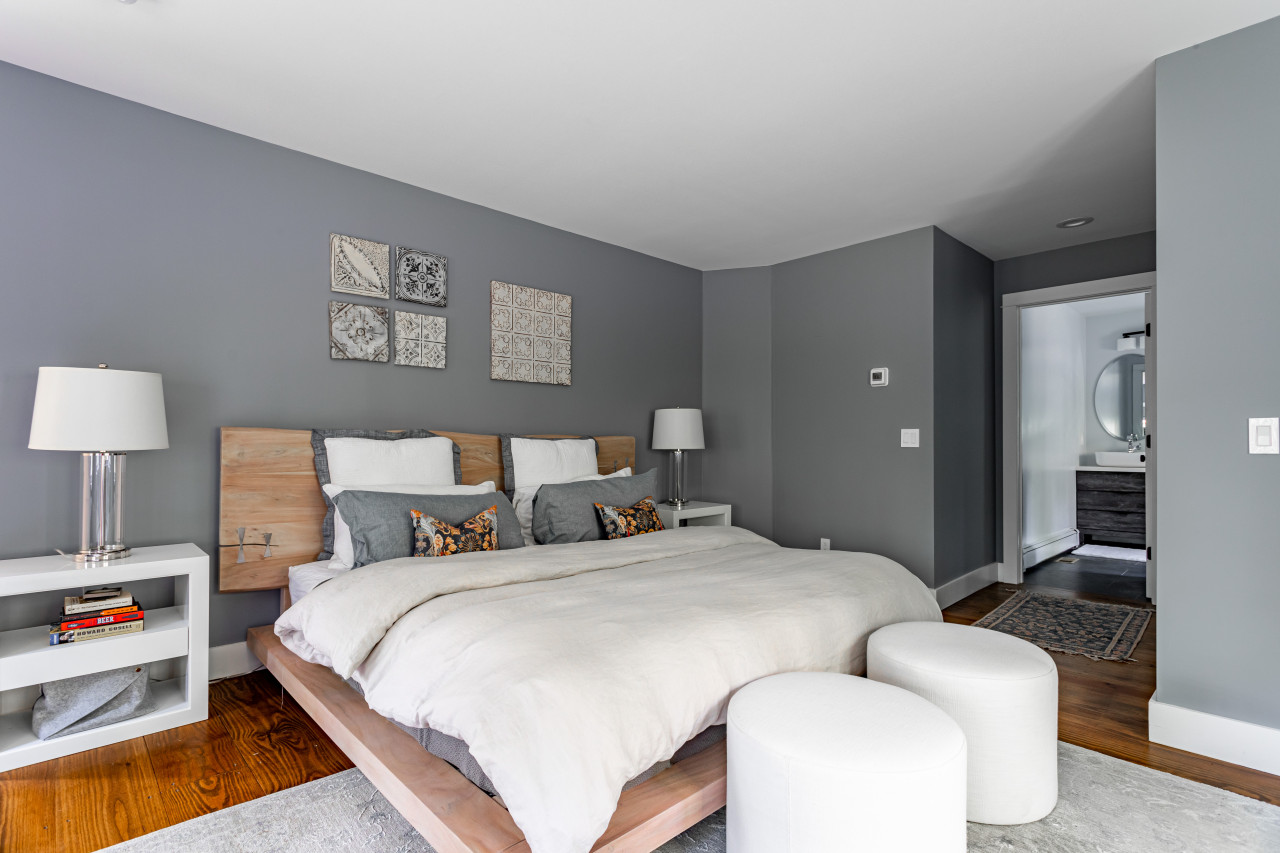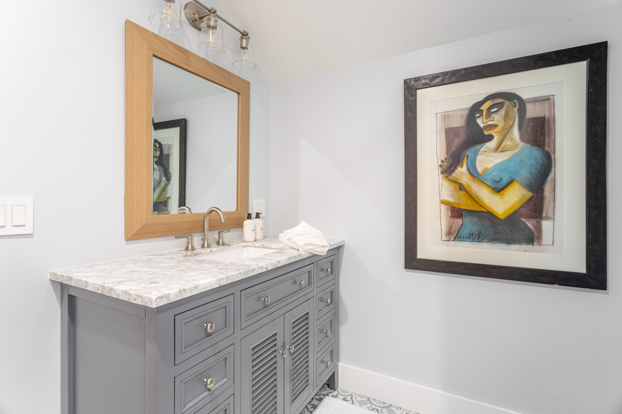 The house offers two further large bedrooms on the upper level. All bedrooms have beautiful linens and soft lighting, while the bathroom is well-stocked with toiletries, towels and a hairdryer. Downstairs, the main level is served with its own powder room.