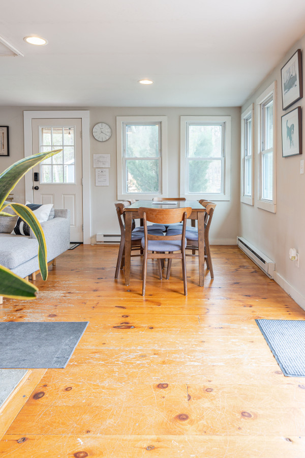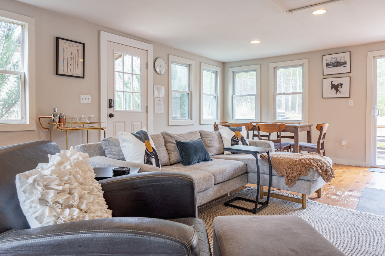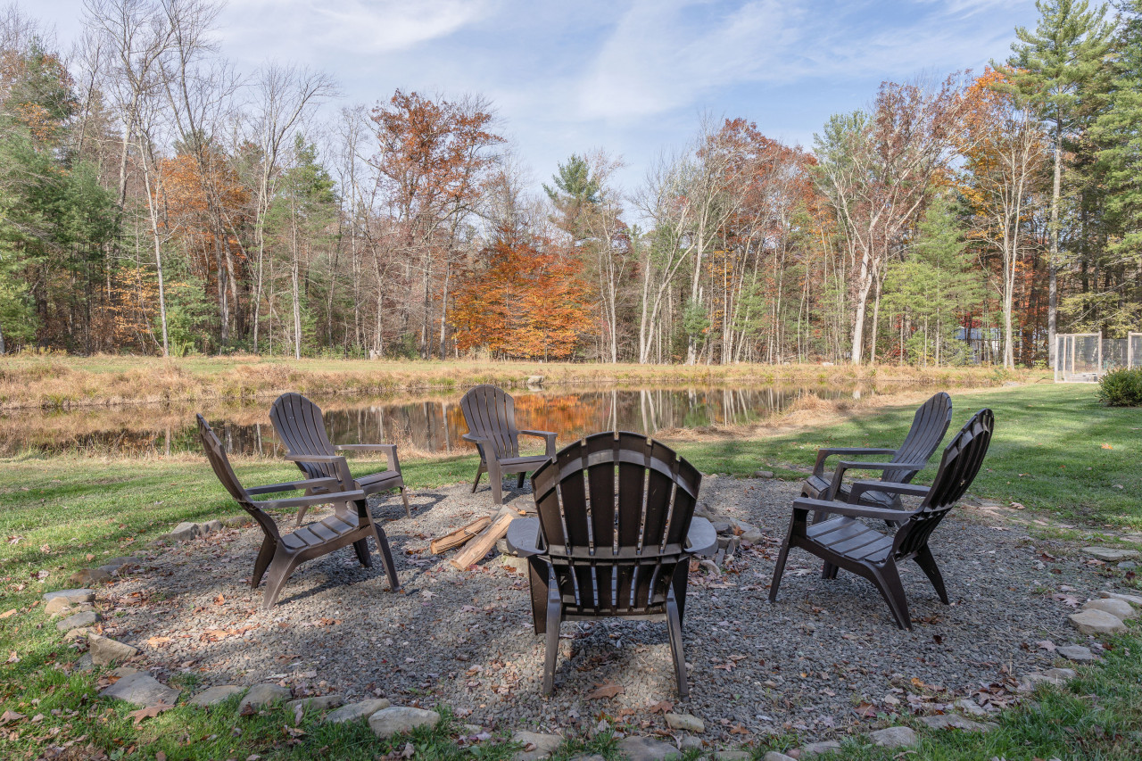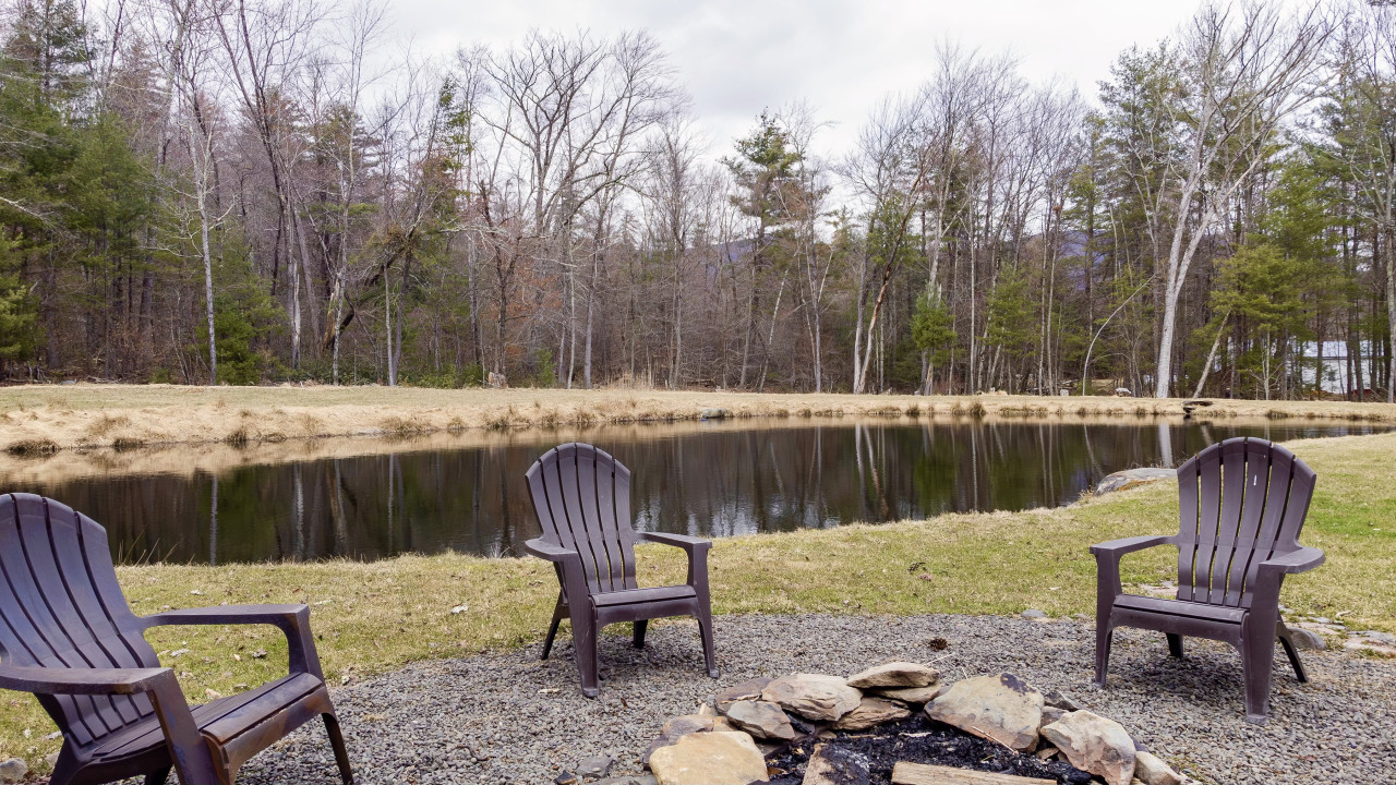 Open the front door to a spacious, bright living room with a wood stove, large television, and plentiful seating. A dining area with views to the pond is adjacent, with the other side given over to a bright and sunny kitchen with gleaming counters and modern appliances.