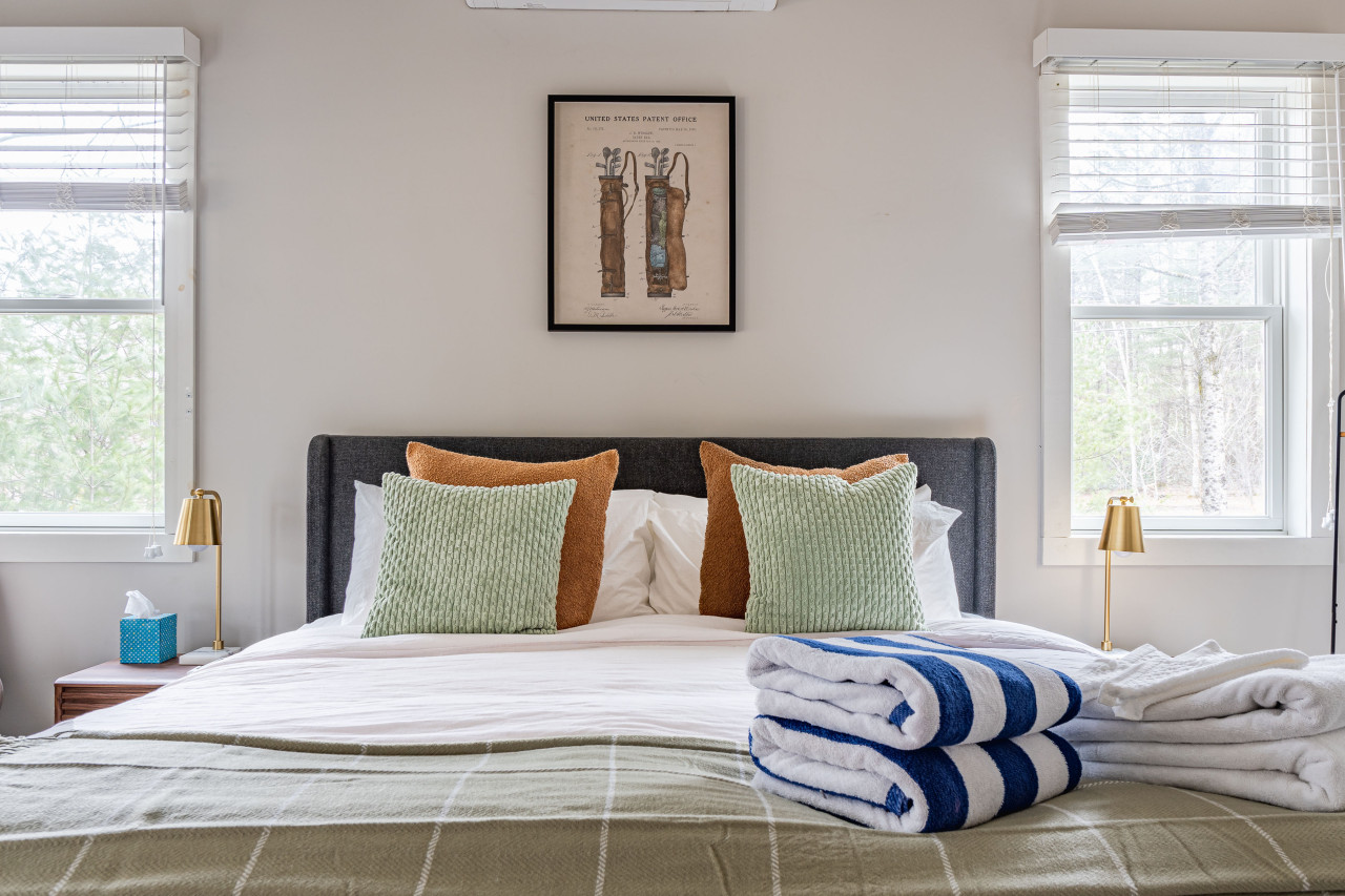 Through the hall is the first of two bathrooms, both with towel heaters. The nearby bedroom is cozy and warm, with a welcoming queen-sized bed and access to the laundry. Continue on down the hall to the stunning principal bedroom. High ceilings, great light, a tv, access to the covered deck, the most comfortable king size bed, as well as its own lovely bathroom with a gorgeous soaking tub are the highlights. In addition, a small, private office is also conveniently nearby.