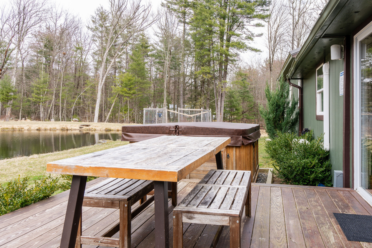 Outside, two decks provide plenty of opportunities to relax. One overlooks the pond and houses the hot tub and grill. The other at the rear is covered from the sun; here you can use the fire-pit or enjoy a meal in the shade.