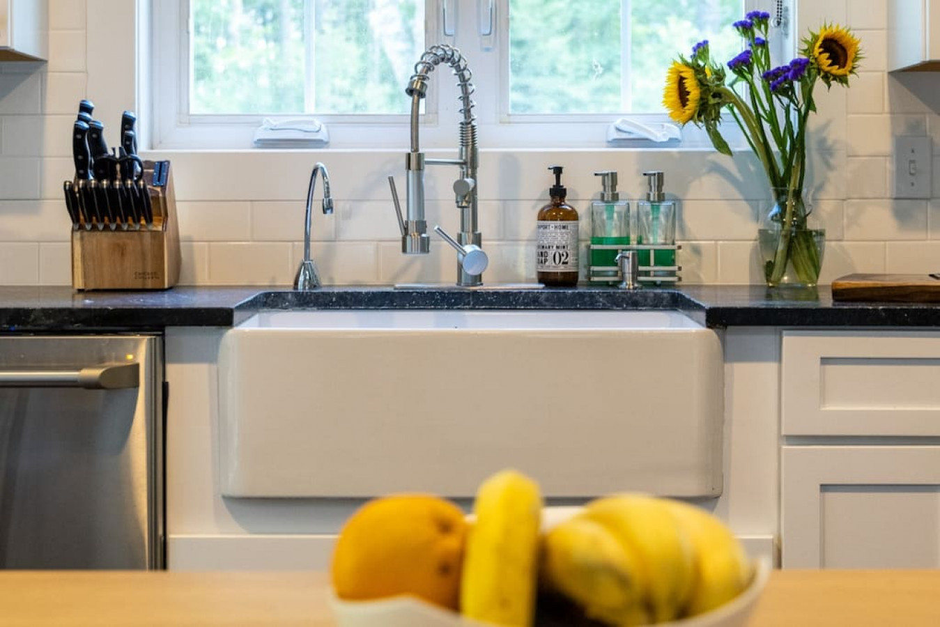 Inside, the home has three levels, providing cozy but contemporary accommodations. While the home exudes a traditional charm and comfort, it is outfitted with up to date features and conveniences such as Sonos and Apple TV’s. The main level great room has excellent flow between kitchen, dining and living areas, ideal for a group and for making sure the chef is never left out. Upstairs has a large principal bedroom and a lovely second bedroom with crib and twin bed; perfect for children who don’t wish to sleep too far from their parents. The lower terrace level has the media room (with a queen sofa bed) and a full guest bedroom with en-suite bathroom and private walk-out to the garden, as well as the laundry area.