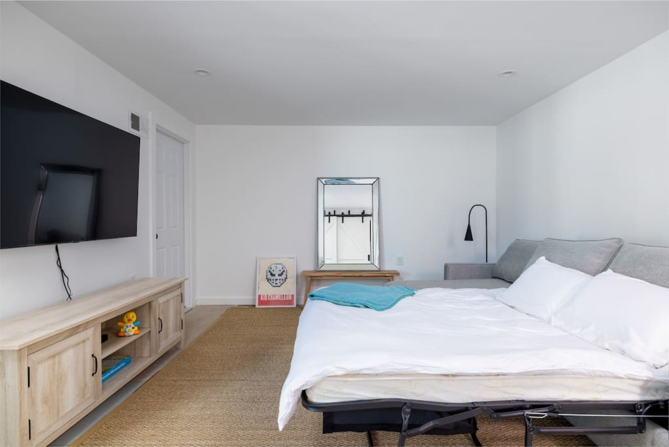 Lower level has a bedroom, en-suite bathroom, living / media room with sofa bed, and laundry