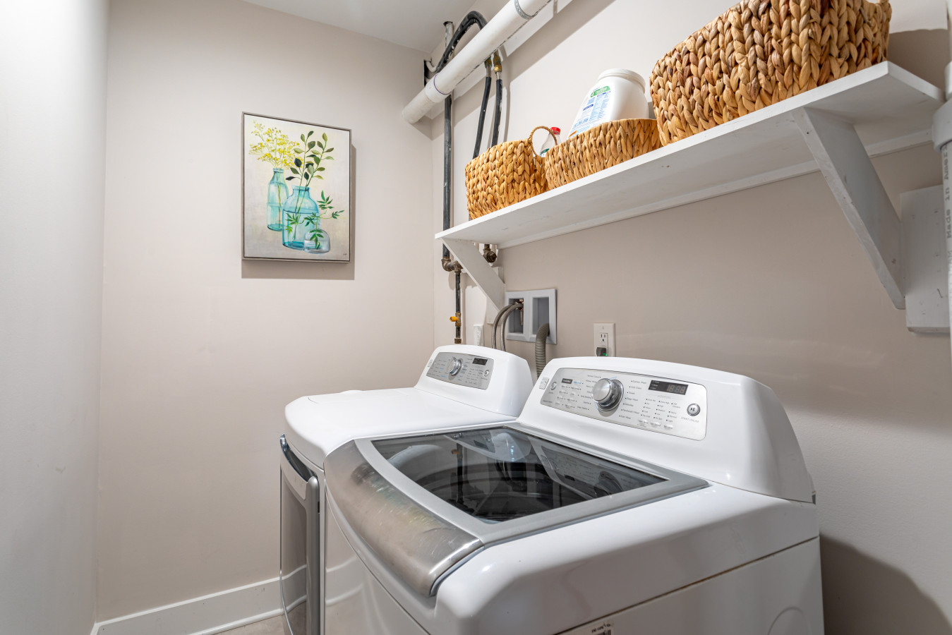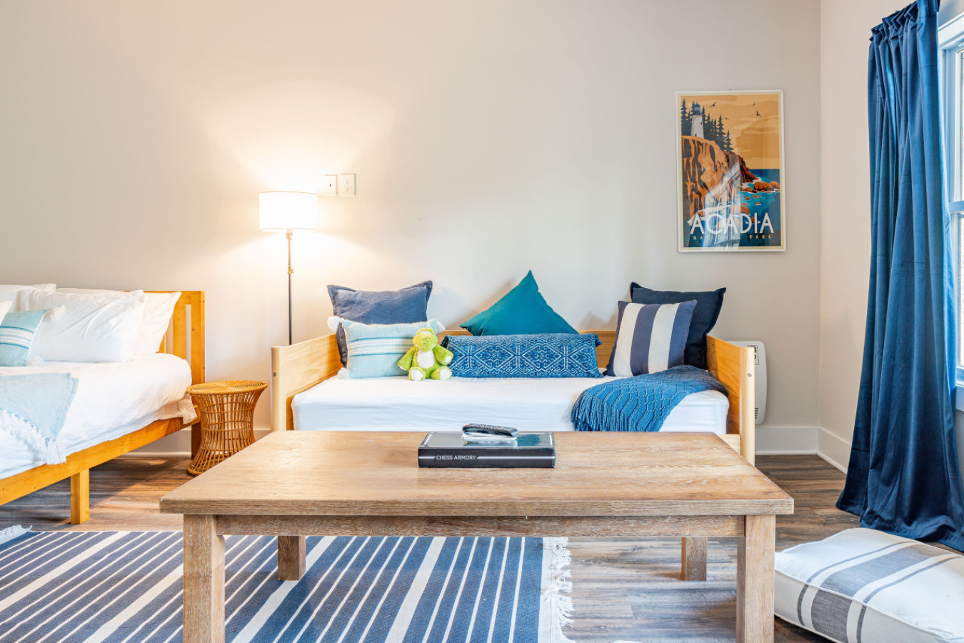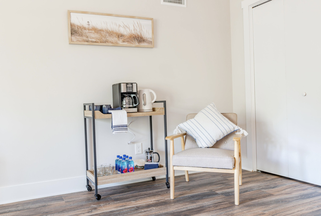 For rest, the house offers sleeping on two levels, with each bedroom taking one area of the house. A large family suite with queen bed, twin bed with trundle, and crib, is on the ground floor, entrance level. Here is the perfect family set up, with everything a family would need as well as the perfect little coffee station for mom and dad. This suite may prove equally nice for seniors, or even early risers who would appreciate the independence of being able to get up and out without waking up the house. While this floor doesn’t have a bathroom, it is conveniently placed for the laundry area. Upstairs are two further queen bedrooms, one with an en-suite bathroom, the other having a hallway bathroom just outside.