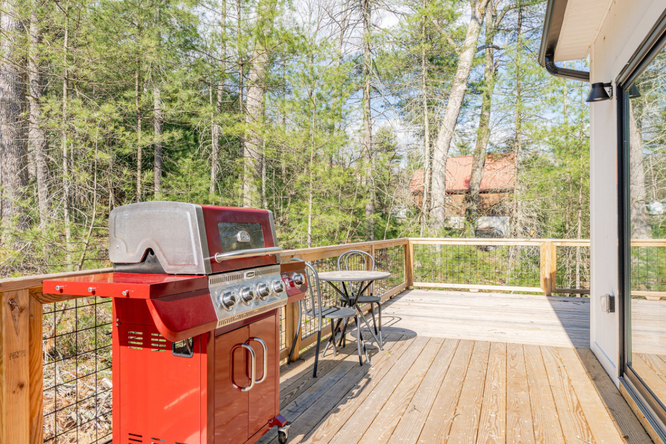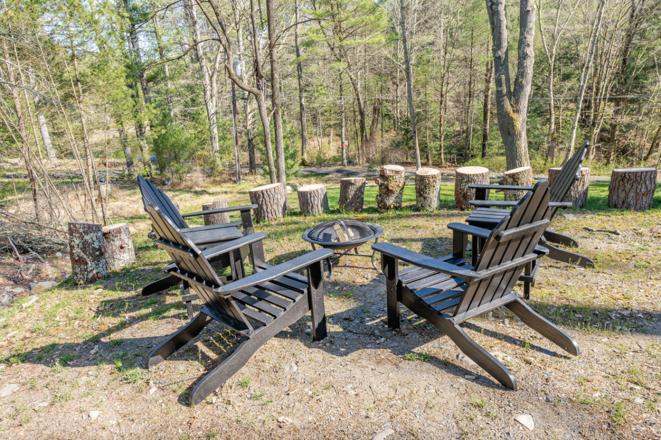 Outside, there is a dining deck with charcoal BBQ, a firepit with seating, and a creek and waterfall just a short walk away.
