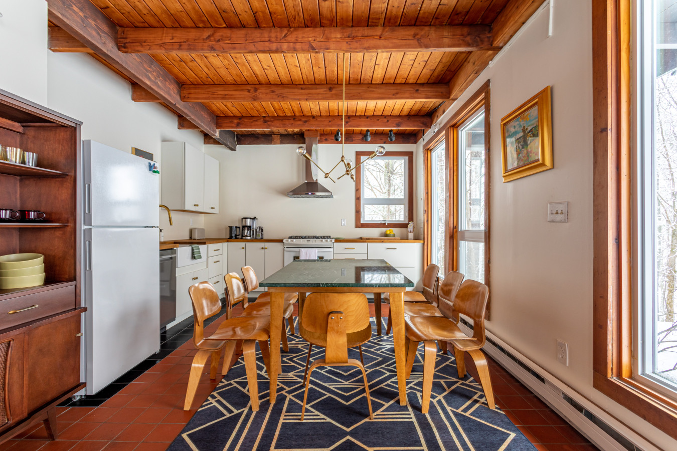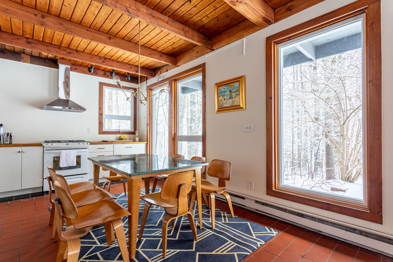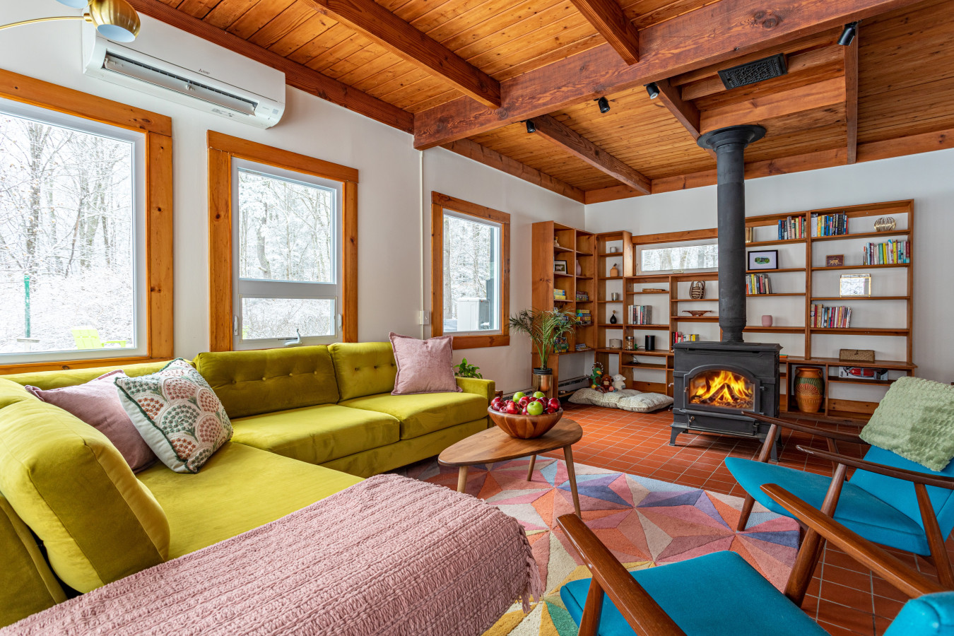 The large living room is anchored by a wood stove, with a library nook at one end and expansive windows at the other - ideal for slow evenings and winter afternoons by the fire. Wood-lined interiors and tiled floors give the home an authentic, old-world cabin feel without sacrificing comfort.