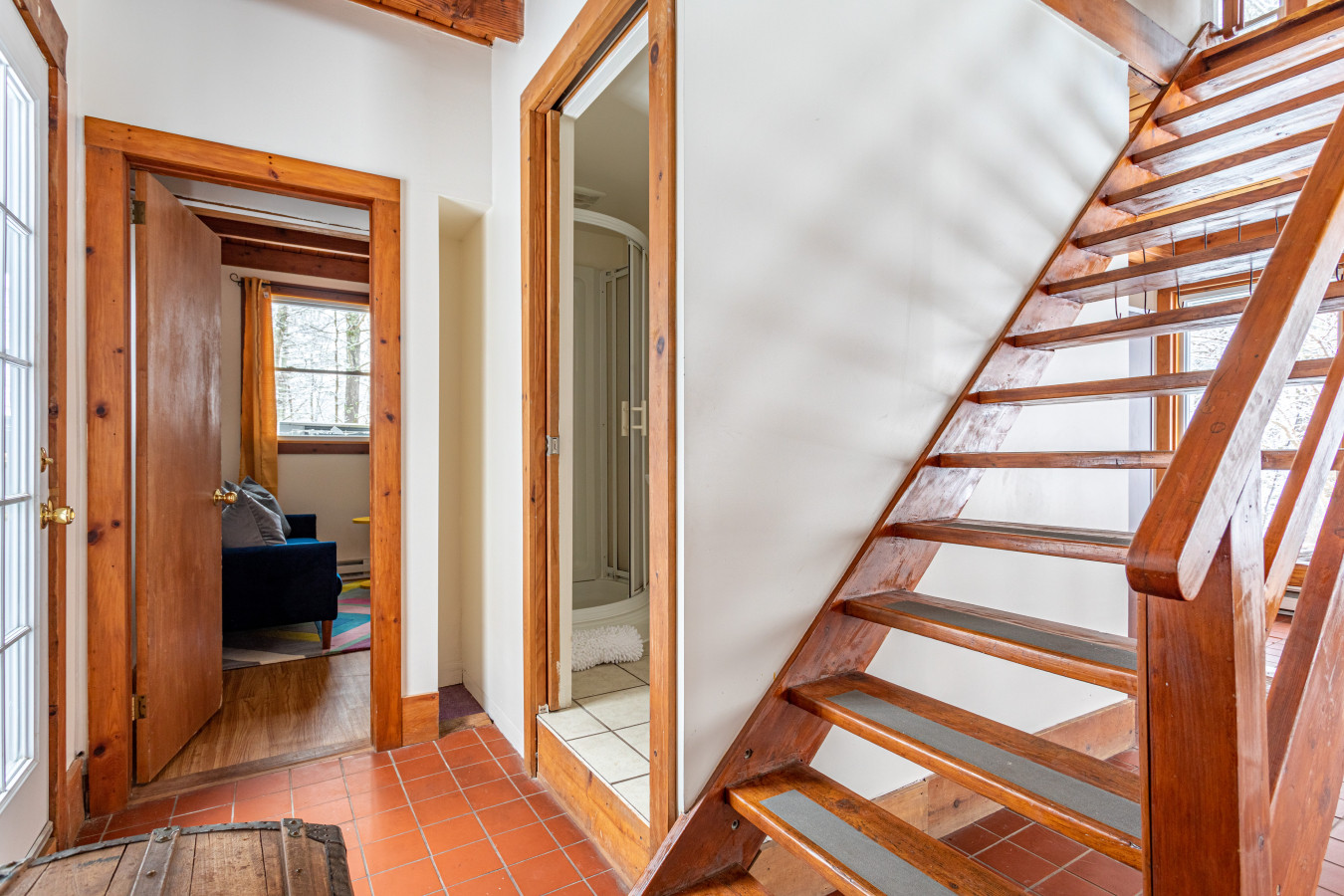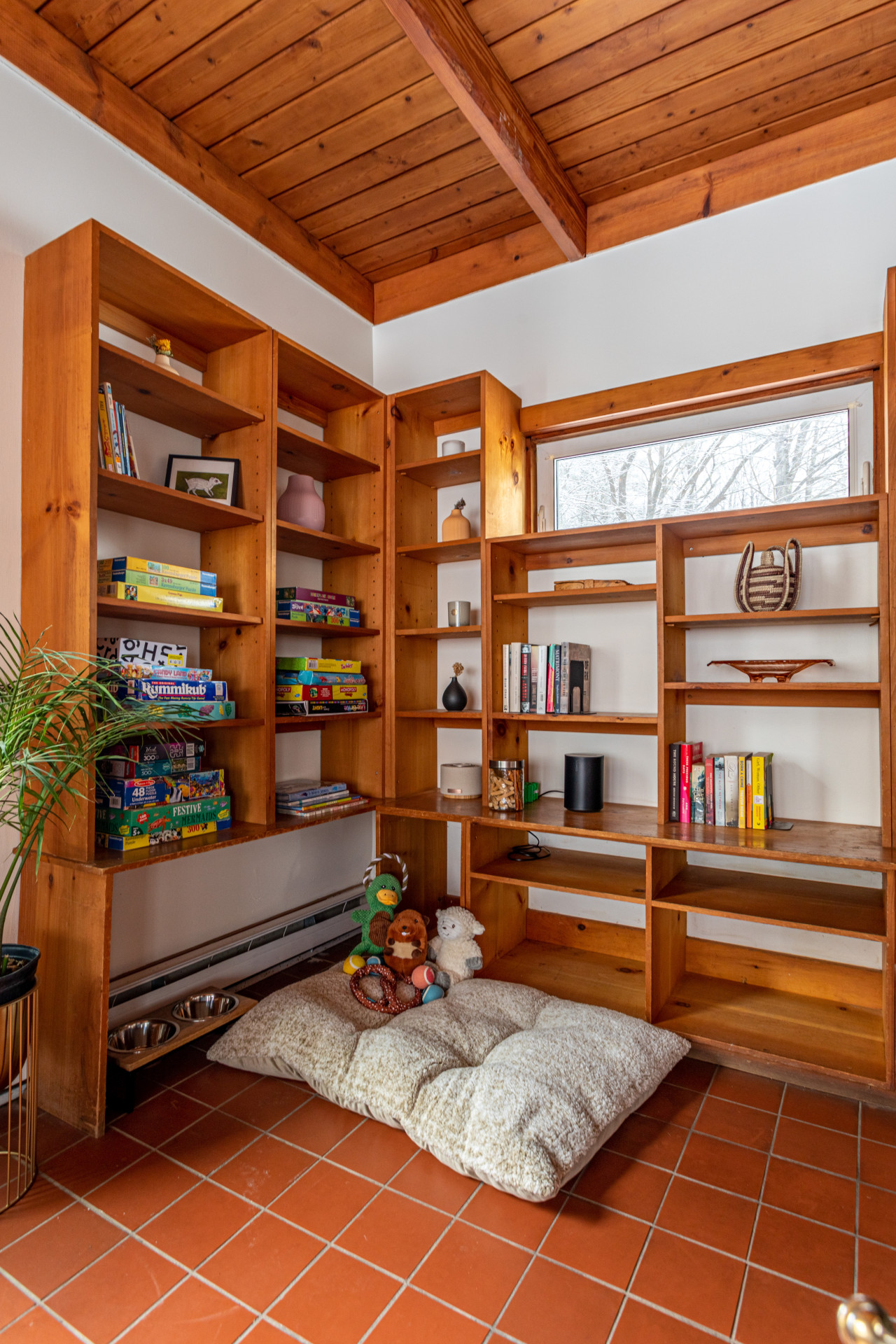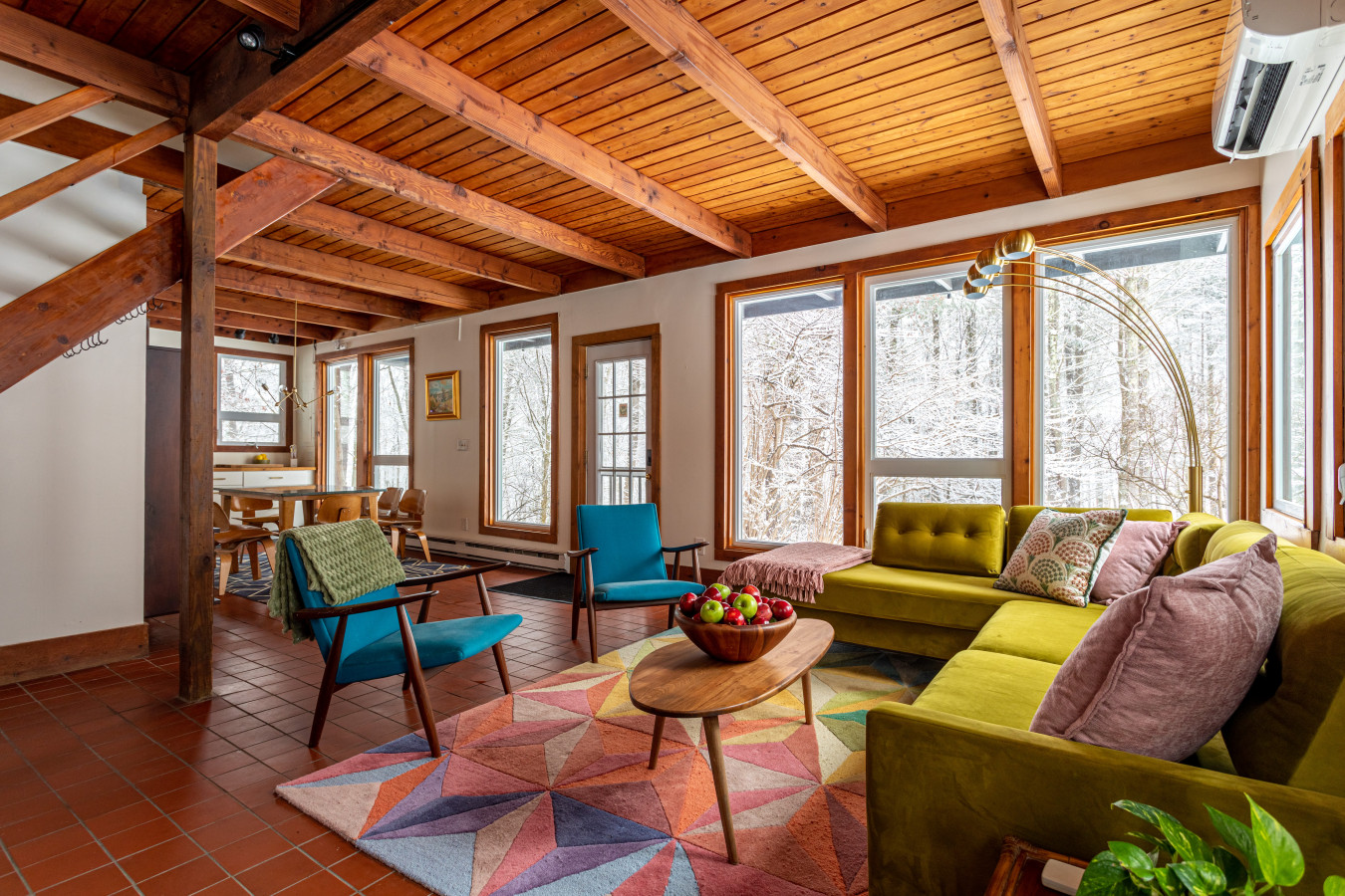 The large living room is anchored by a wood stove, with a library nook at one end and expansive windows at the other - ideal for slow evenings and winter afternoons by the fire. Wood-lined interiors and tiled floors give the home an authentic, old-world cabin feel without sacrificing comfort.