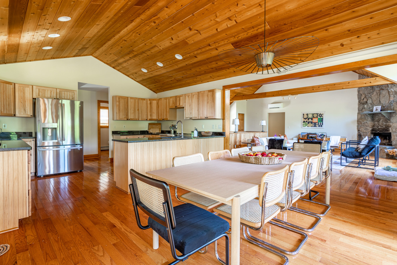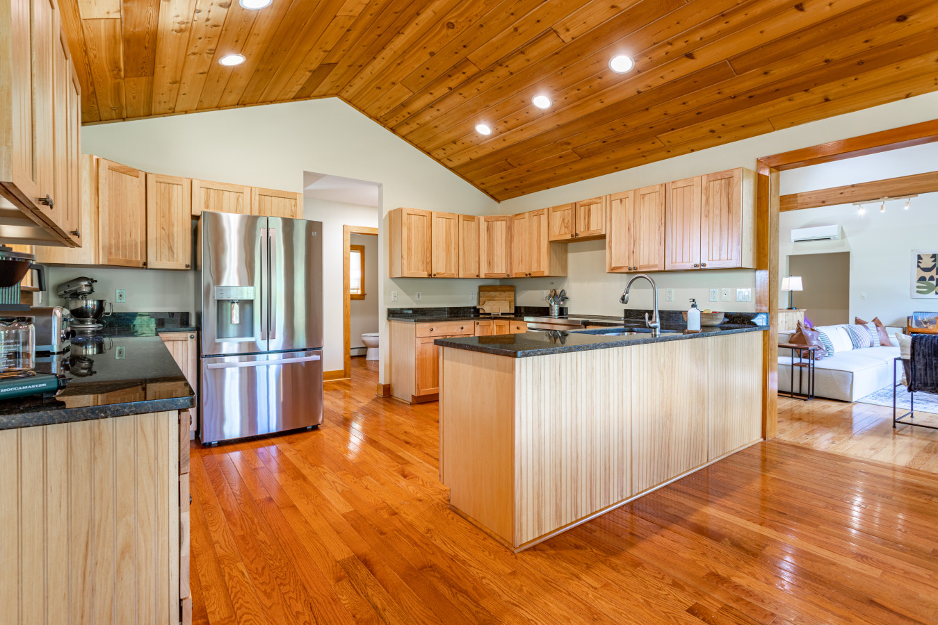 The heart of the home is a large, well-equipped chef’s kitchen with a peninsula island for casual seating and a dining area that comfortably seats 10—perfect for shared meals and conversation.