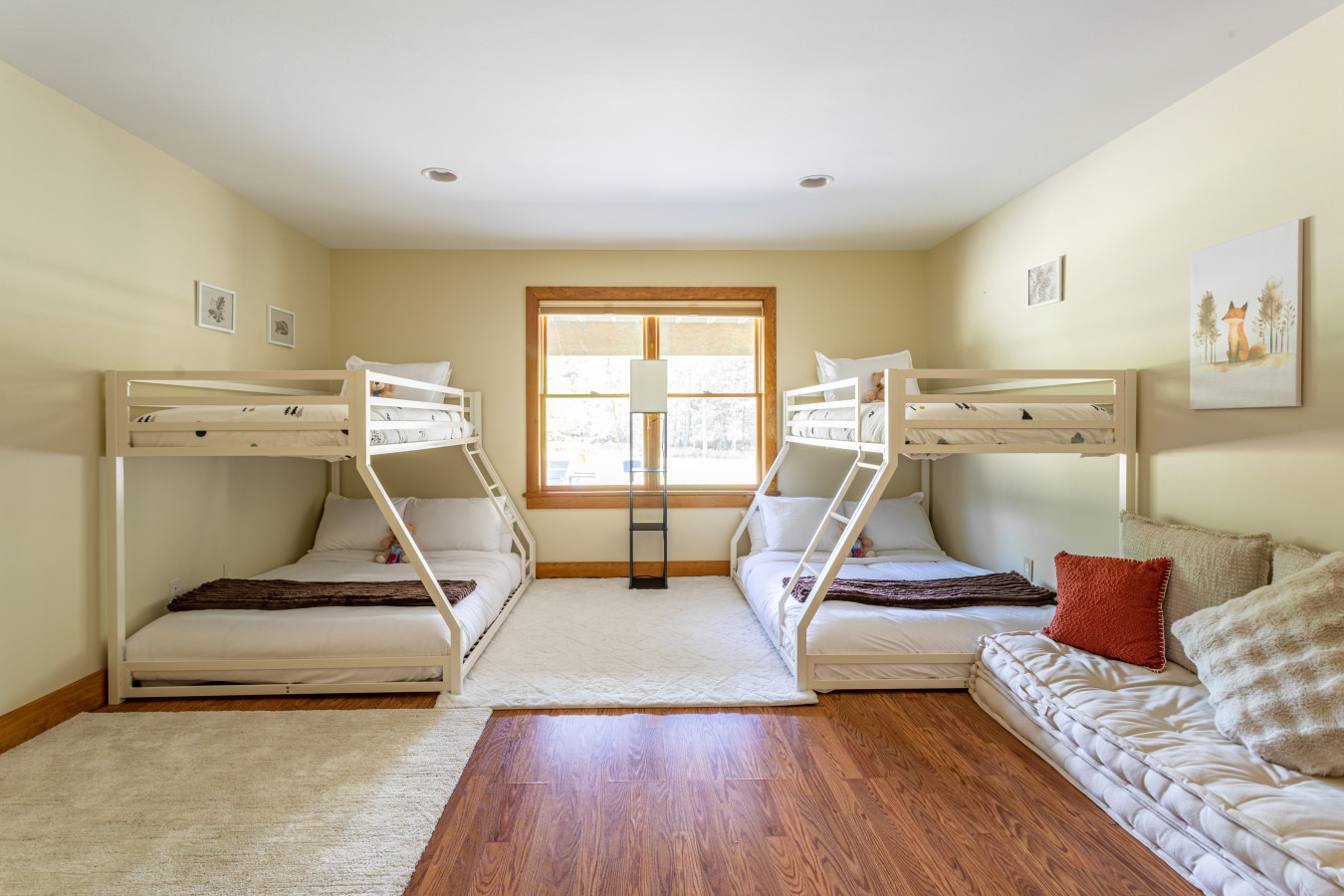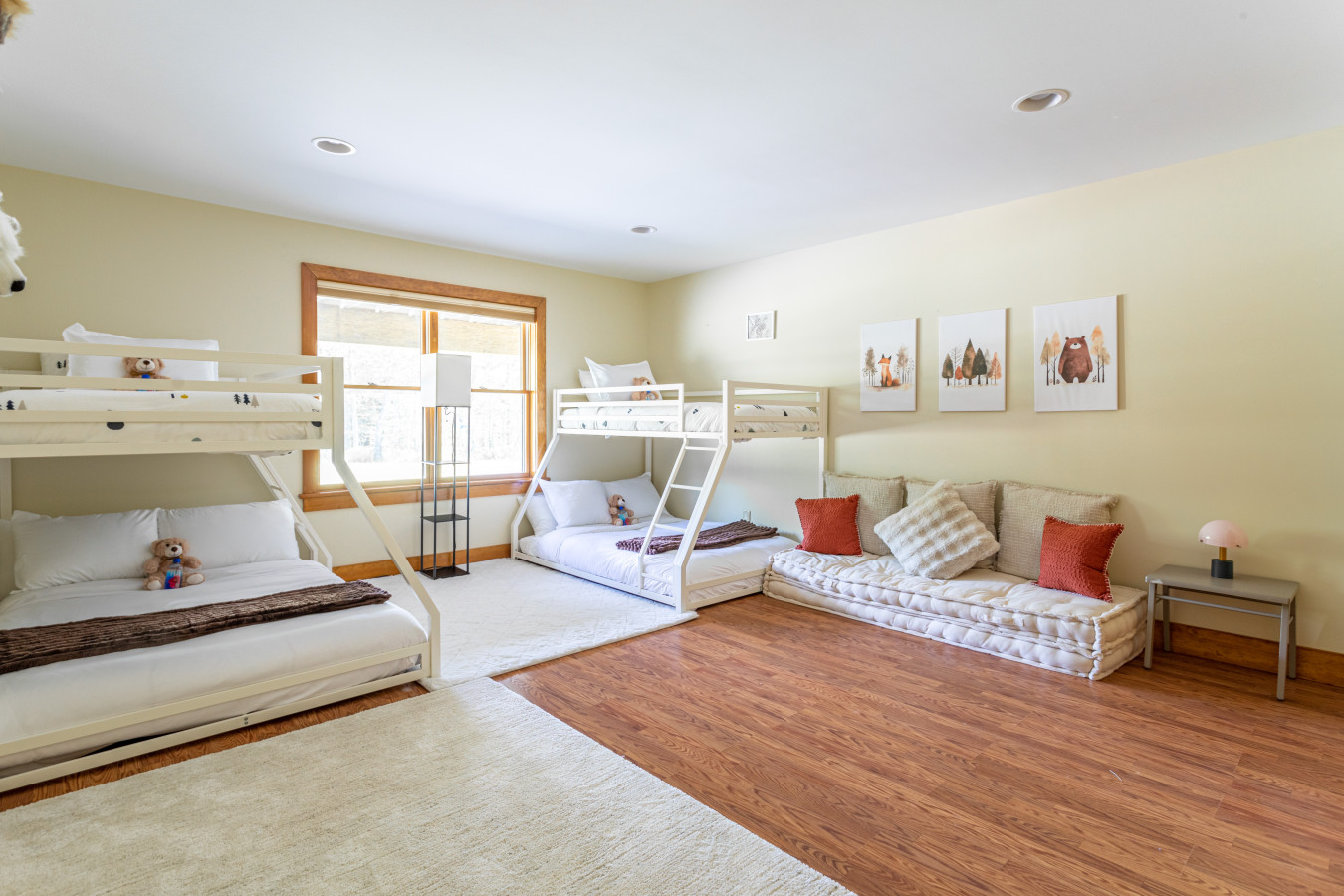 Downstairs is where the fun continues: a spacious TV and playroom area make it a hit with kids and teens, and two oversized bedrooms provide flexible sleeping arrangements. One has two bunk setups (with full-size beds on the bottom and twins on top), and the other features two queen beds plus a full-size crib. These rooms share a modern hallway bathroom.