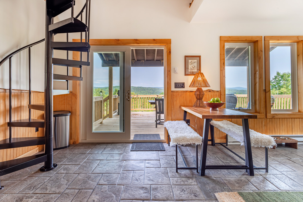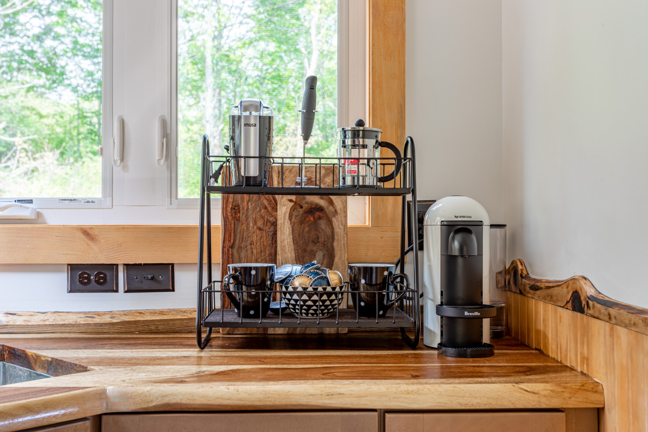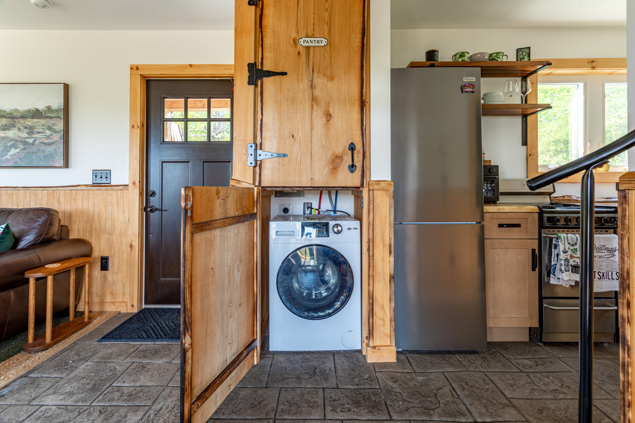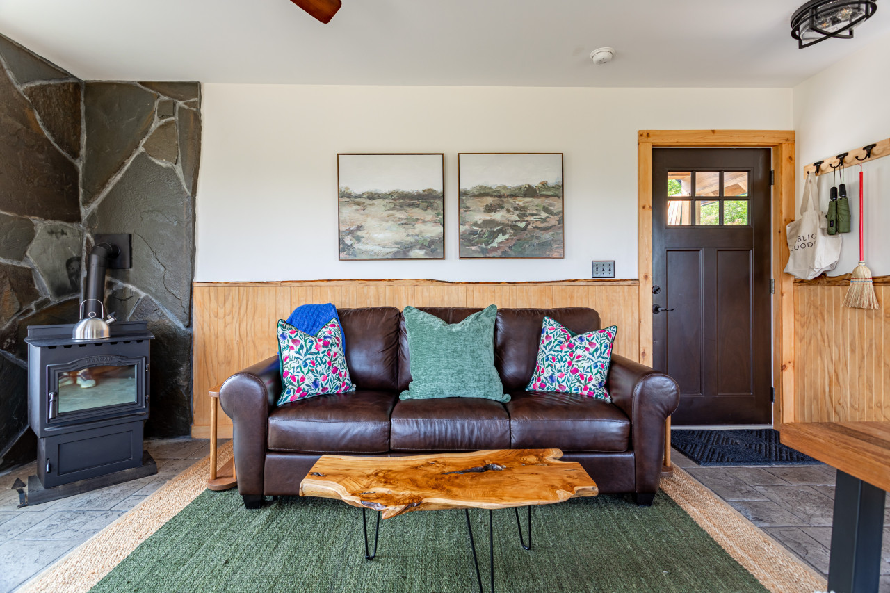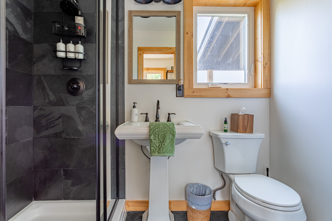 Inside you will find cozy interiors. The main level has a great kitchen with all the appliances you would need (fridge, stove, dishwasher, toaster oven). The coffee set up is excellent and there’s even a pantry and a compact European steam washer/ dryer. The living area has forever views, a comfy leather sofa, rocking chair, and an easy to use pellet wood stove. The bathroom has a gorgeous slate shower and plenty of room for storage.