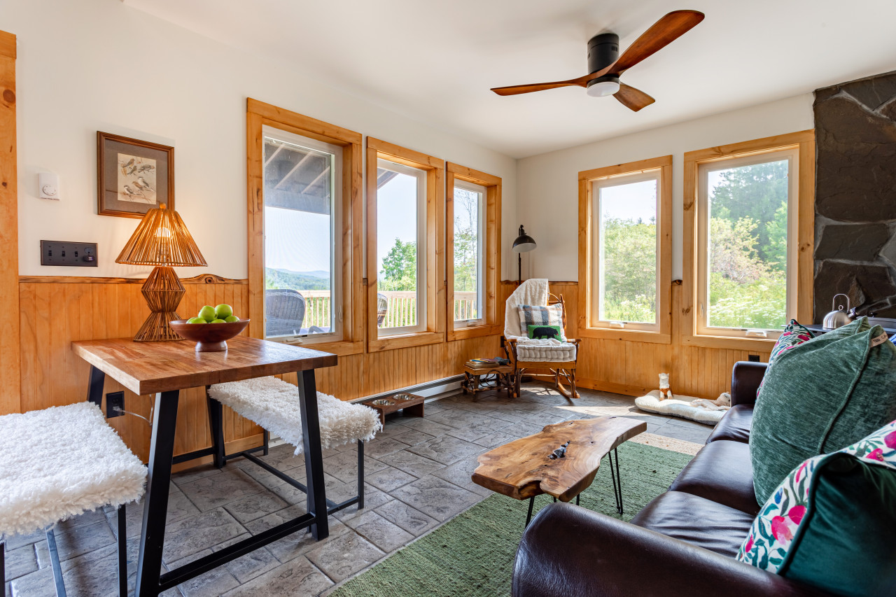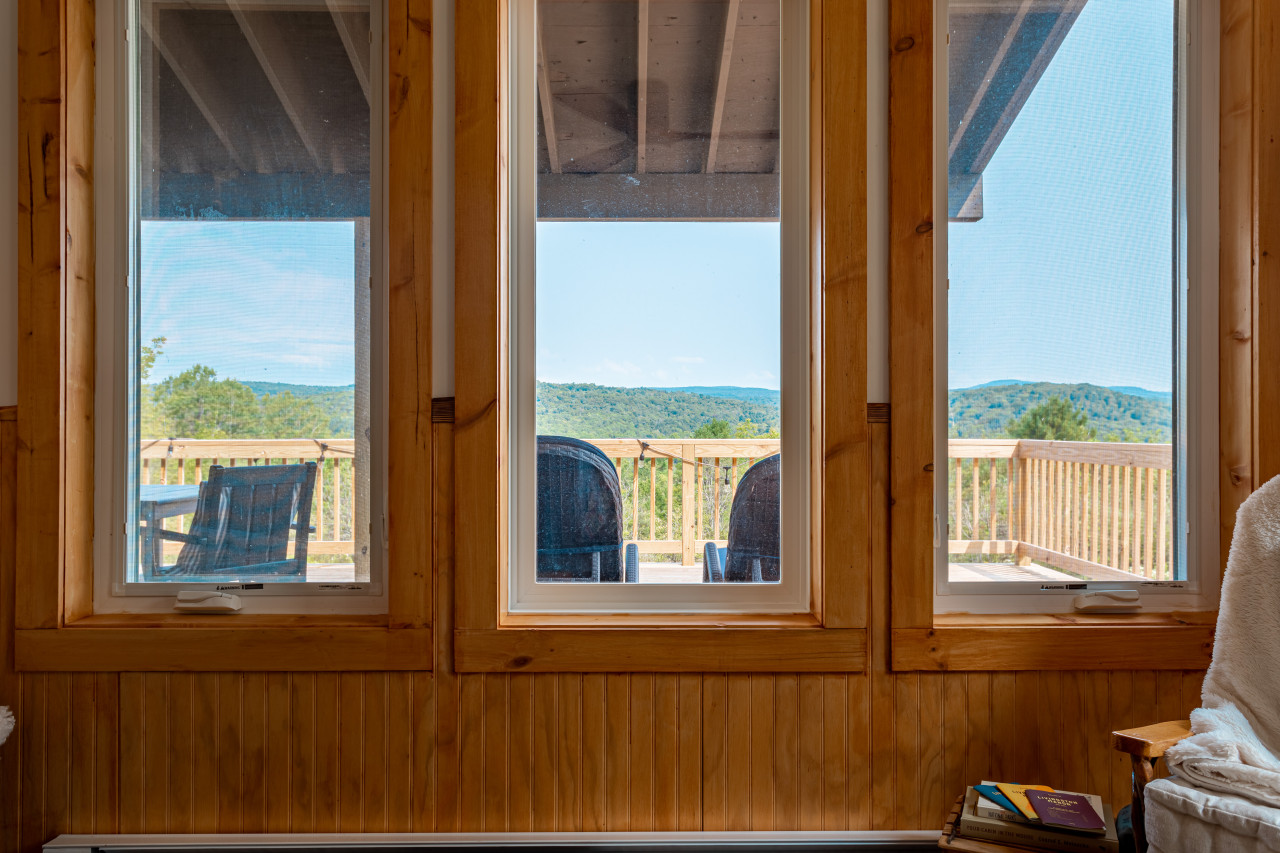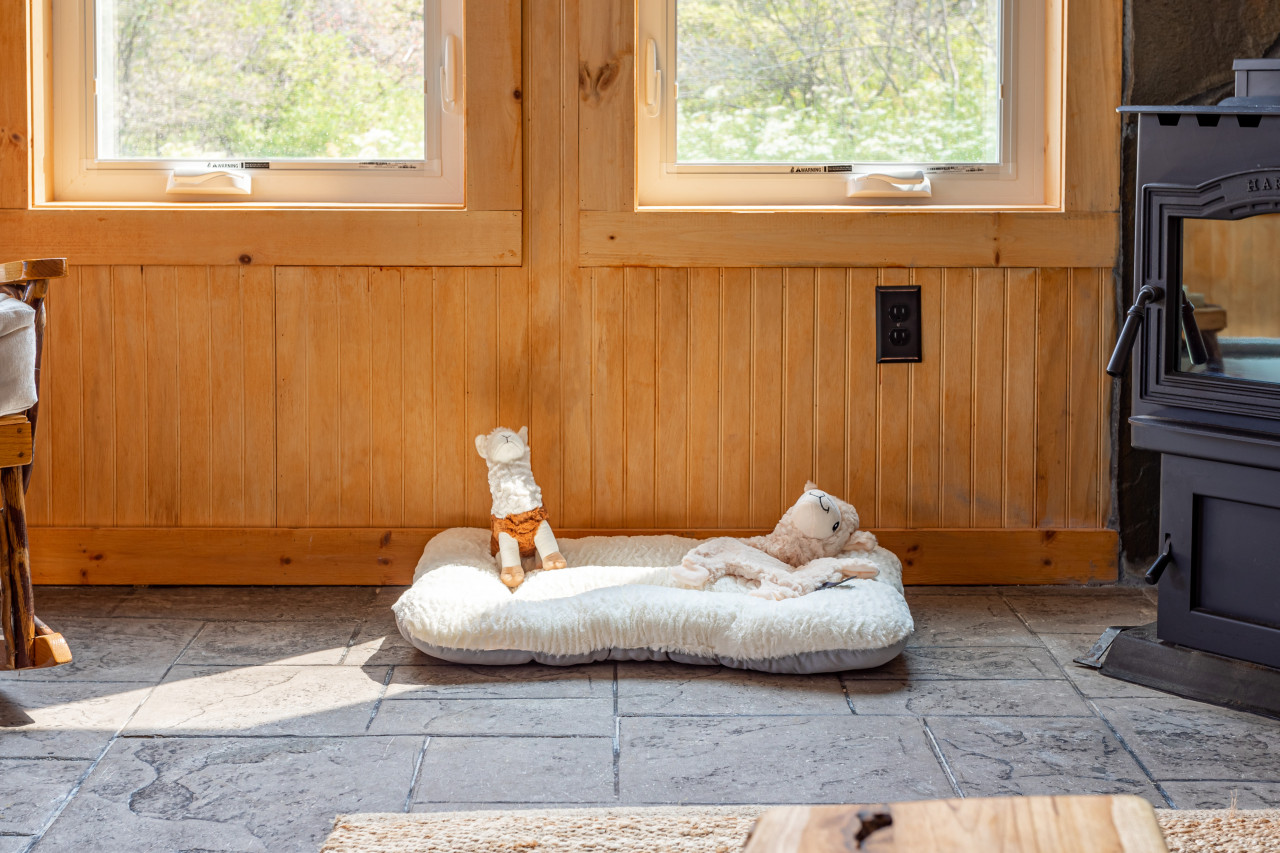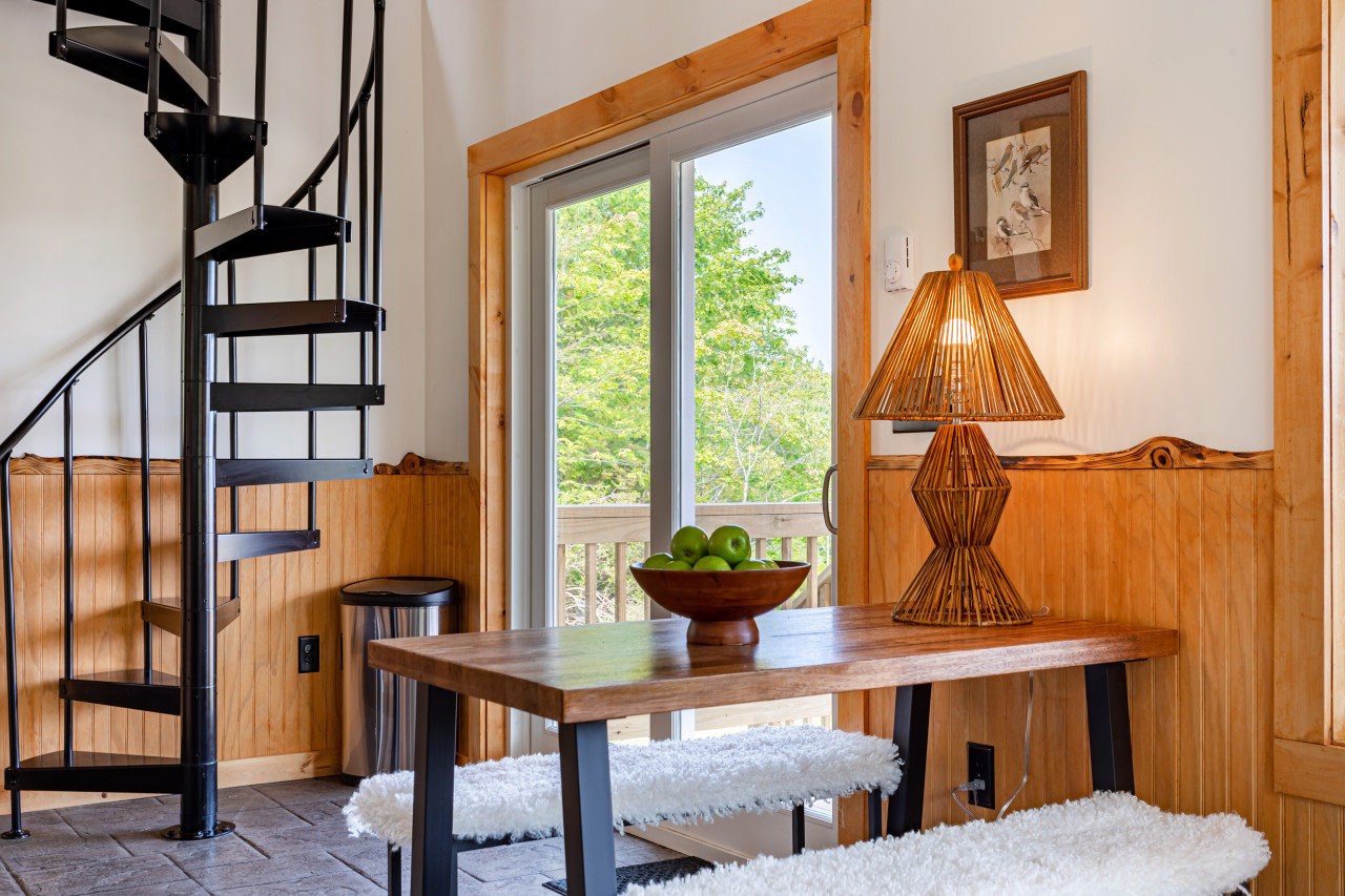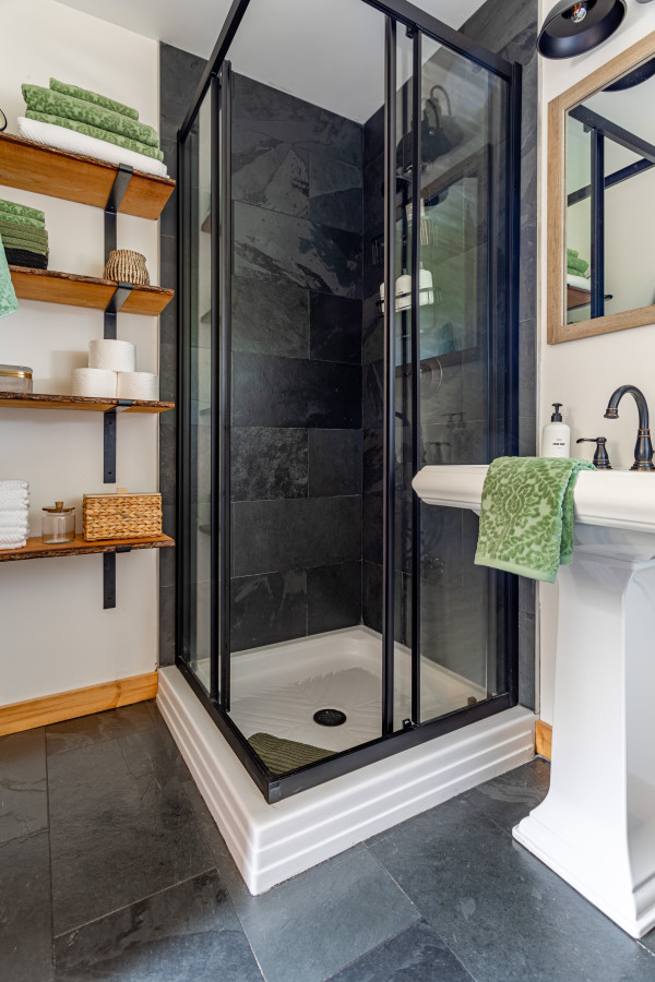 Inside you will find cozy interiors. The main level has a great kitchen with all the appliances you would need (fridge, stove, dishwasher, toaster oven). The coffee set up is excellent and there’s even a pantry and a compact European steam washer/ dryer. The living area has forever views, a comfy leather sofa, rocking chair, and an easy to use pellet wood stove. The bathroom has a gorgeous slate shower and plenty of room for storage.