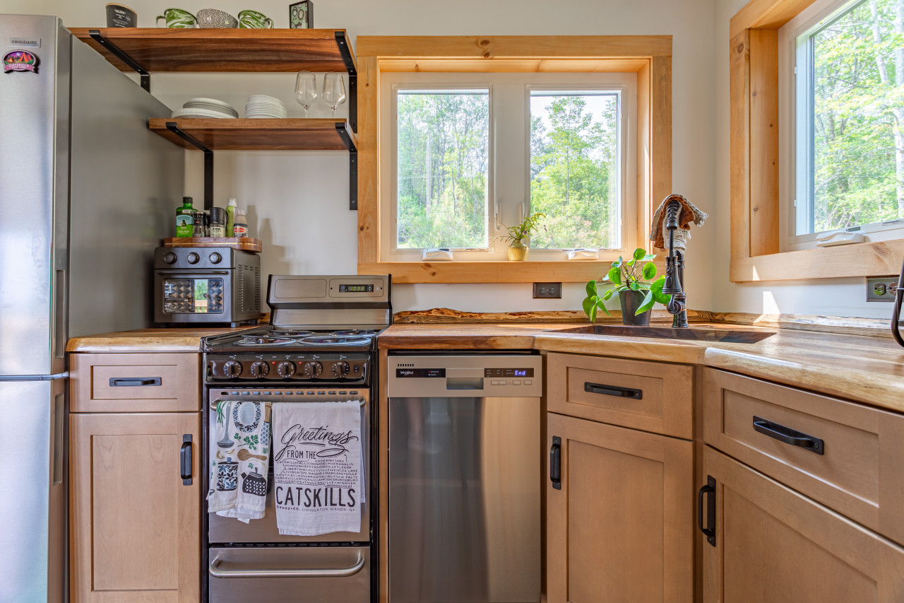 Perched on the crest of the hilly DeBruce hamlet near Livingston Manor, this tiny home (684 sq ft) lives large. It has every amenity that comes with a larger home, and some lovely additions.