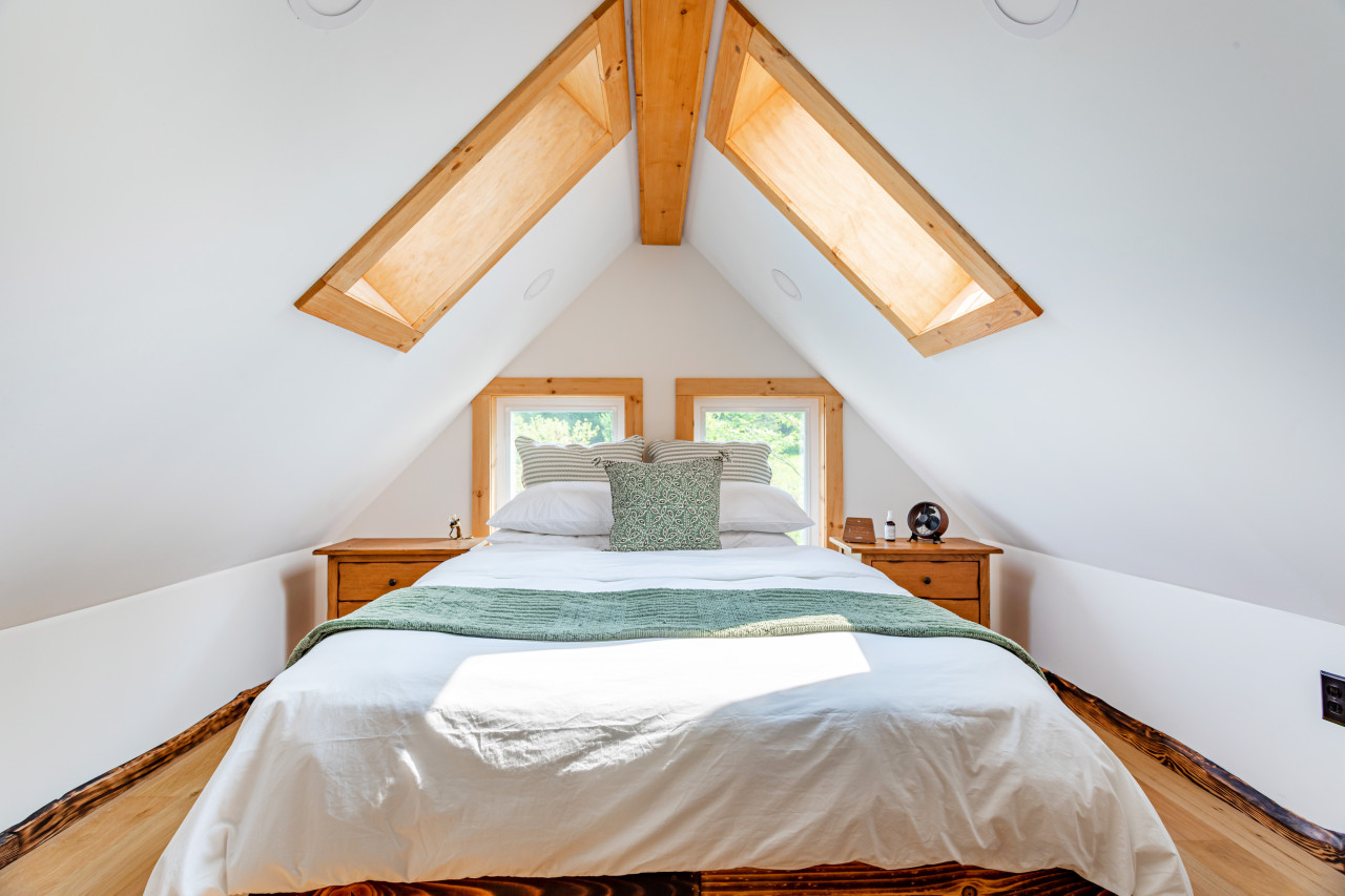 Upstairs is the bright bedroom with vaulted attic style ceilings. Spacious and creatively furnished, with its own desk area, this is a lovely sunny room with skylights giving beautiful views to the night sky and stars.