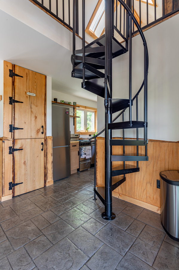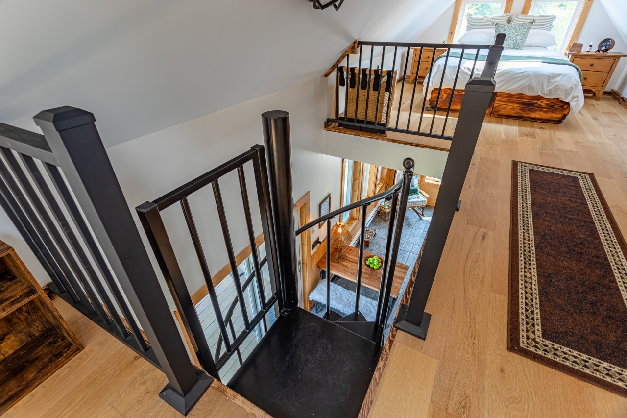 Upper level is accessed via a spiral staircase