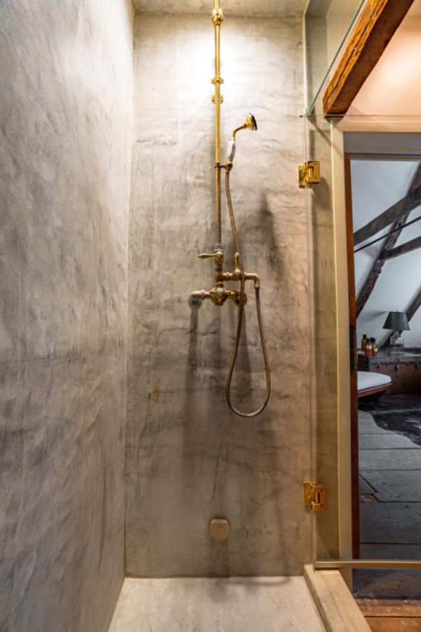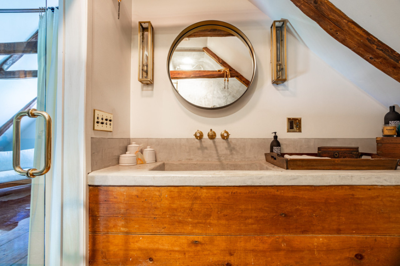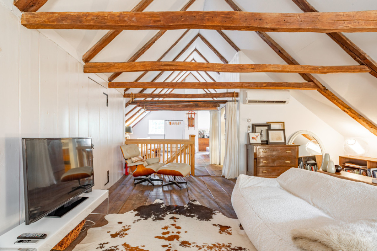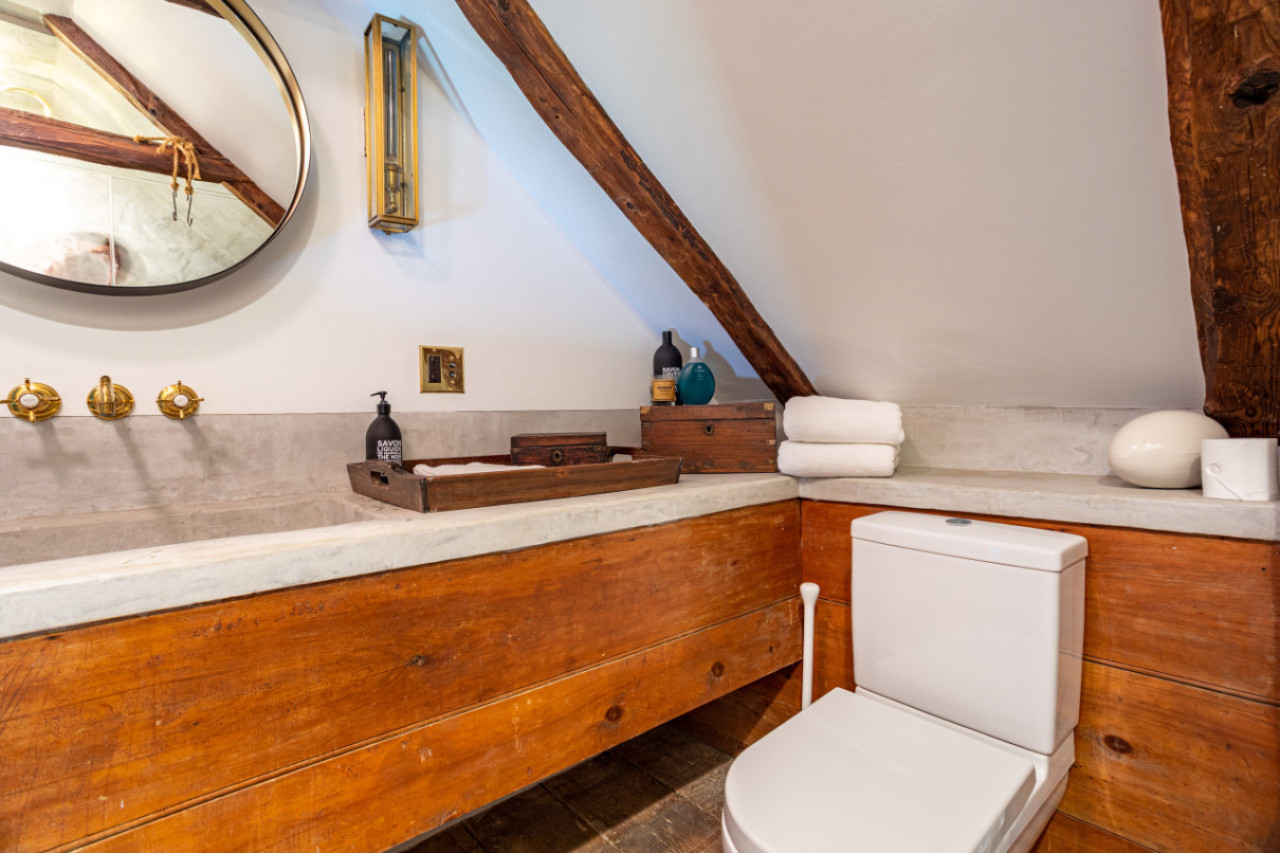Upstairs is the principal bedroom suite, with vaulted ceilings, supported by beautiful 300 year old timber. Spacious and creatively furnished, with its own sitting area with tv and luxury bathroom, this is the ultimate cocoon within a cocoon. The bathroom has a steam shower and heavenly Aesop products.