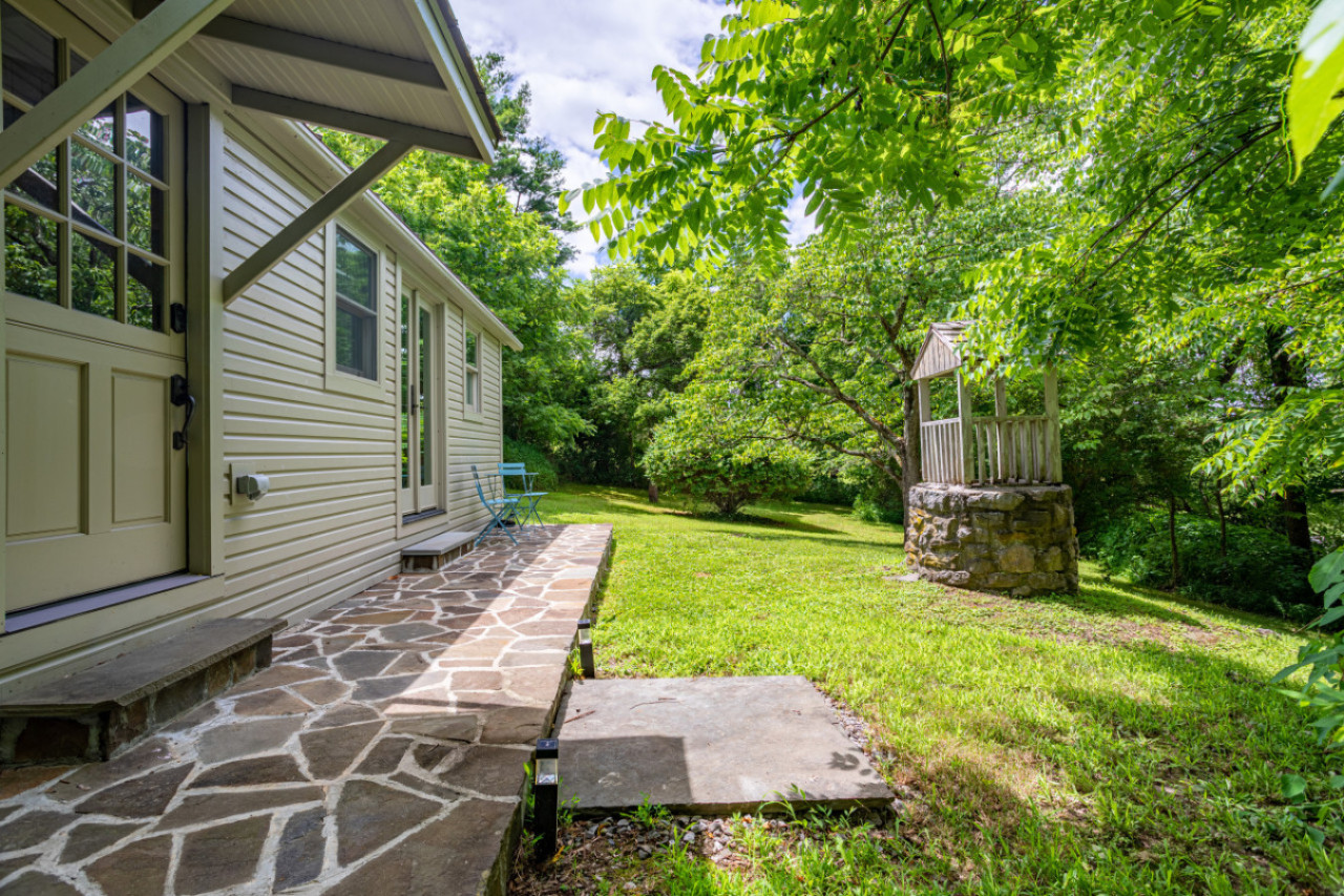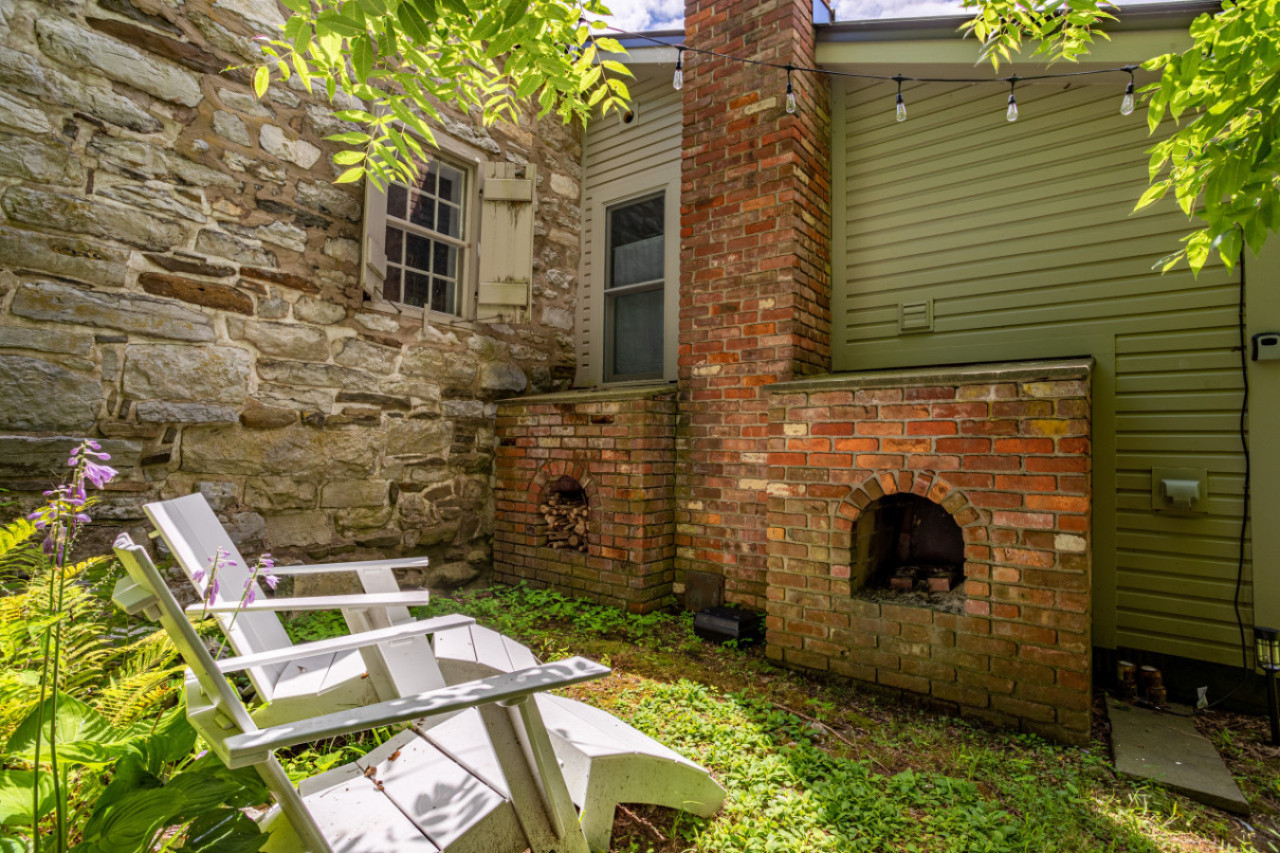 The lovely garden has a west facing stone patio (perfect for evening cocktails) with bistro seating and an adorable fireplace with Adirondack chairs.
