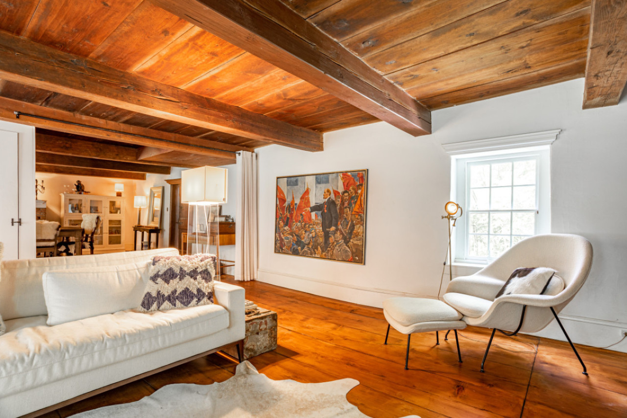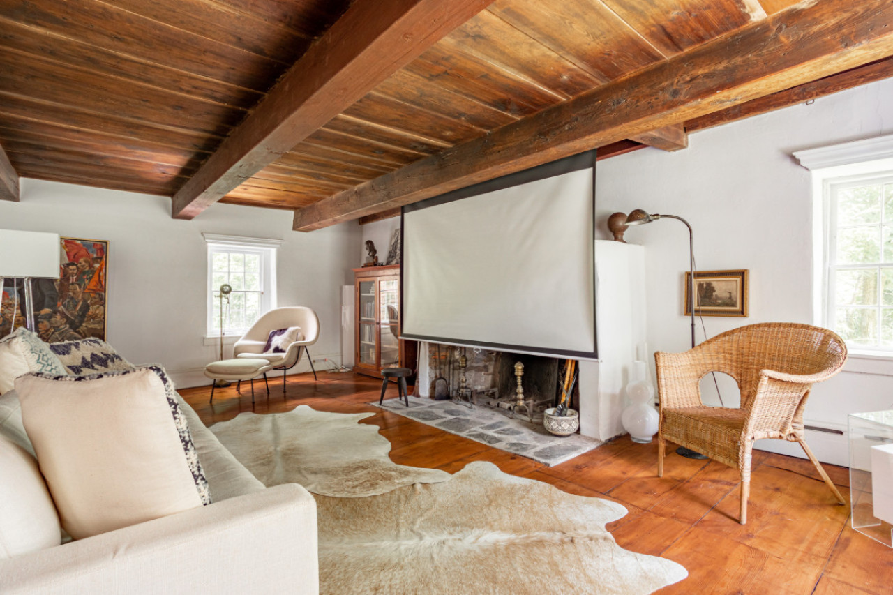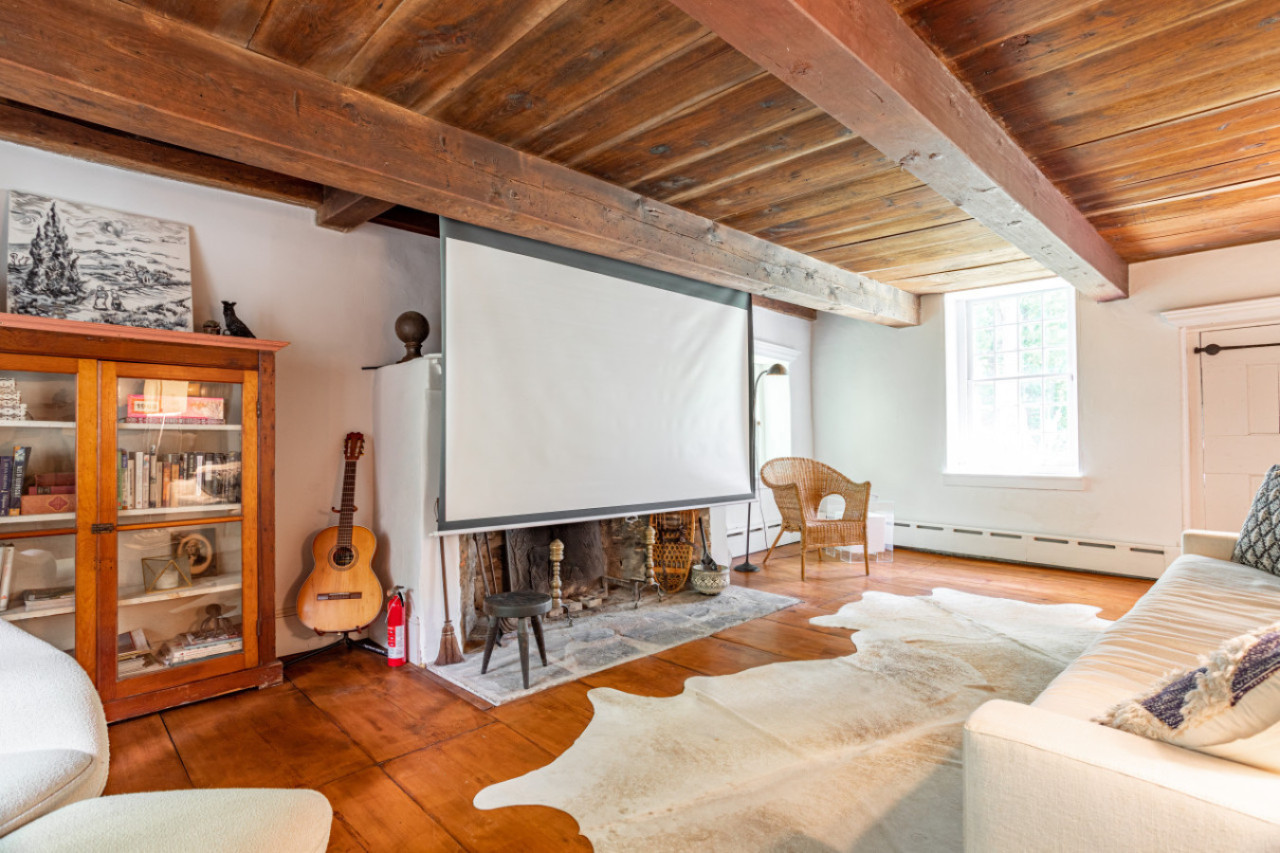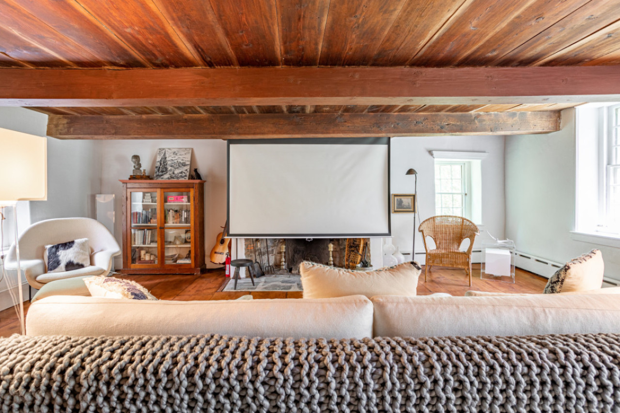 Two chimneys anchor each end of the main level gathering spots. A super elongated sofa, perfect for napping, sits across from the fireplace. Behind one of the beautiful beams is a hidden projector screen, making for a memorable movie night.