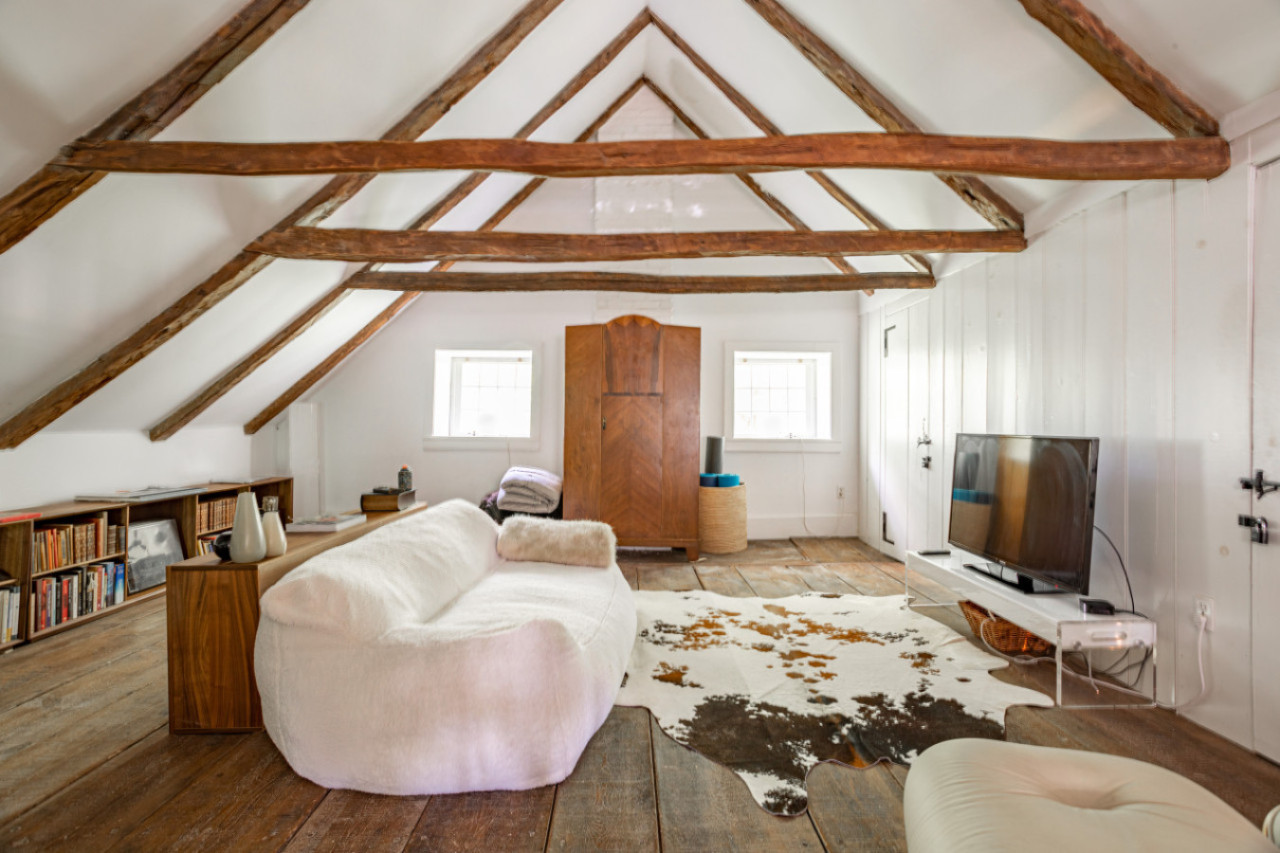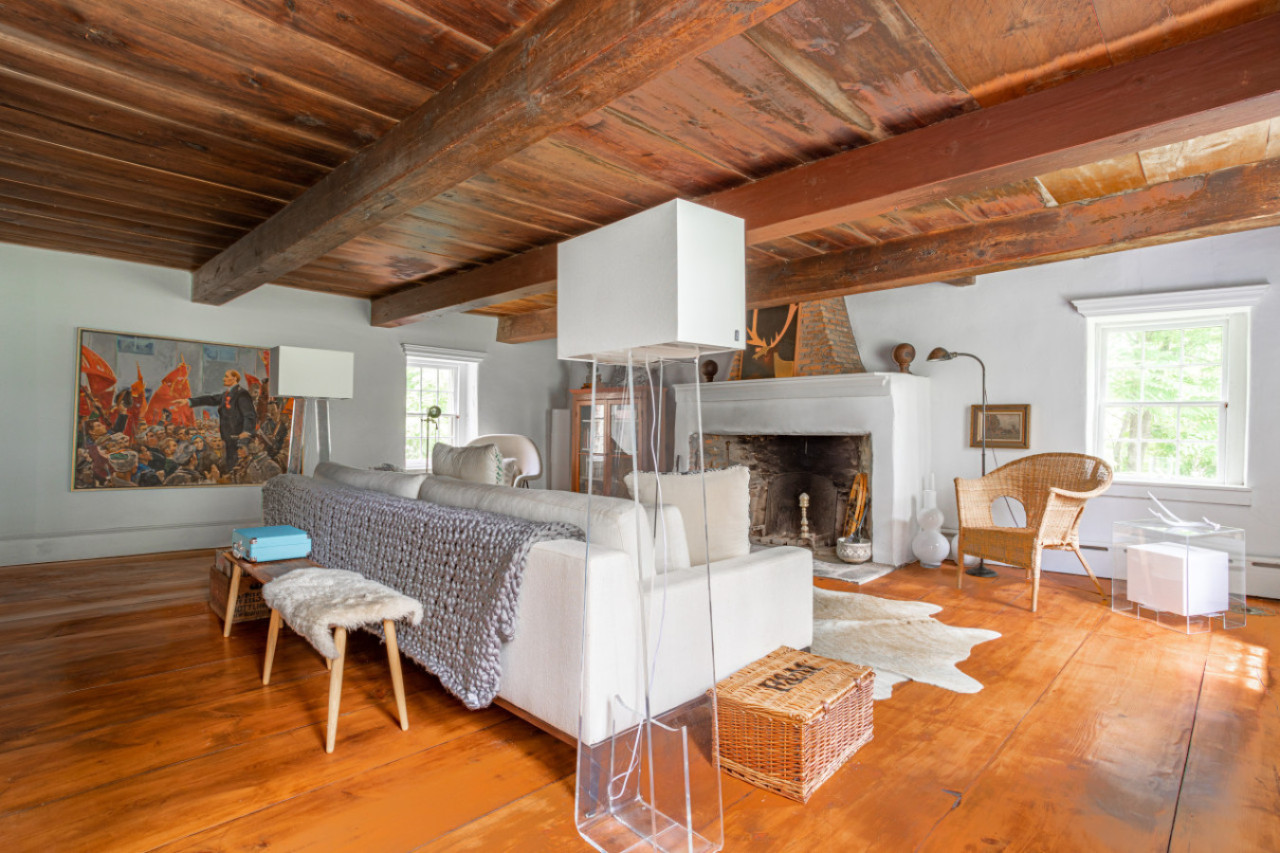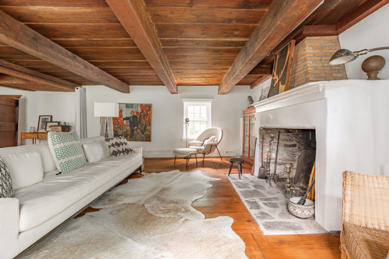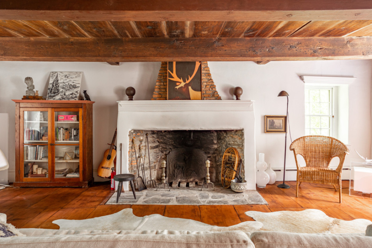 Two chimneys anchor each end of the main level gathering spots. A super elongated sofa, perfect for napping, sits across from the fireplace. Behind one of the beautiful beams is a hidden projector screen, making for a memorable movie night.