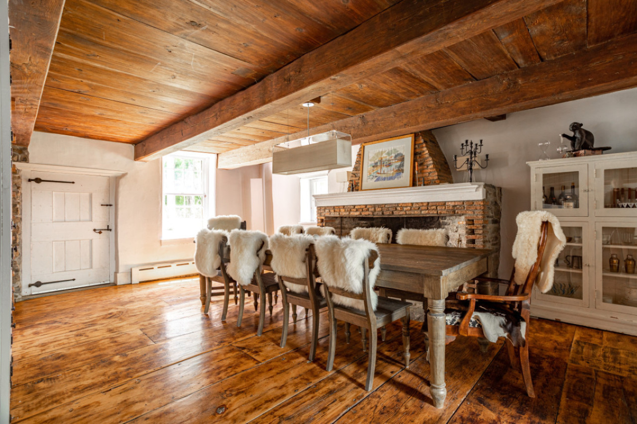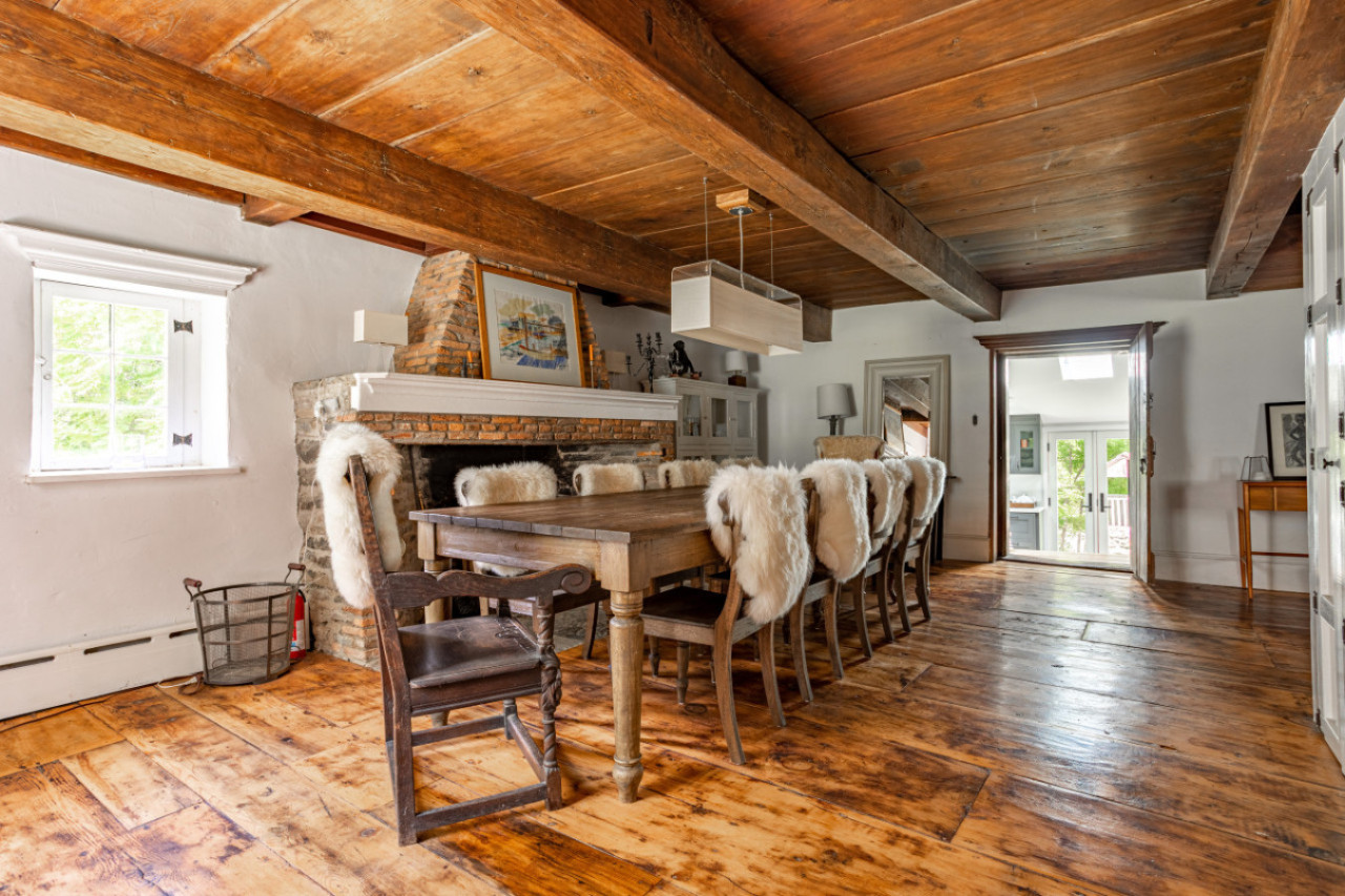 Across on the other side of the main floor is the dining area. Another huge fireplace and a beautiful generous table are the main accents here. While the house sleeps a very limited number of people, it would make a lovely spot for hosting a dinner party for friends.